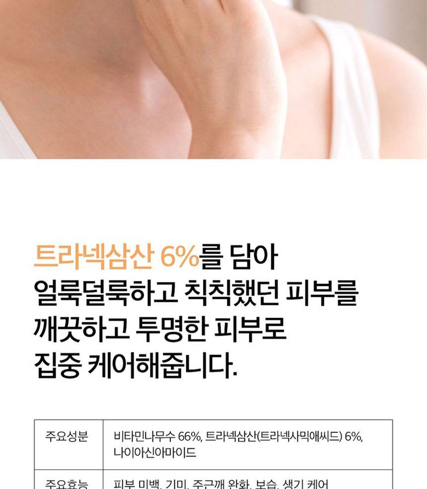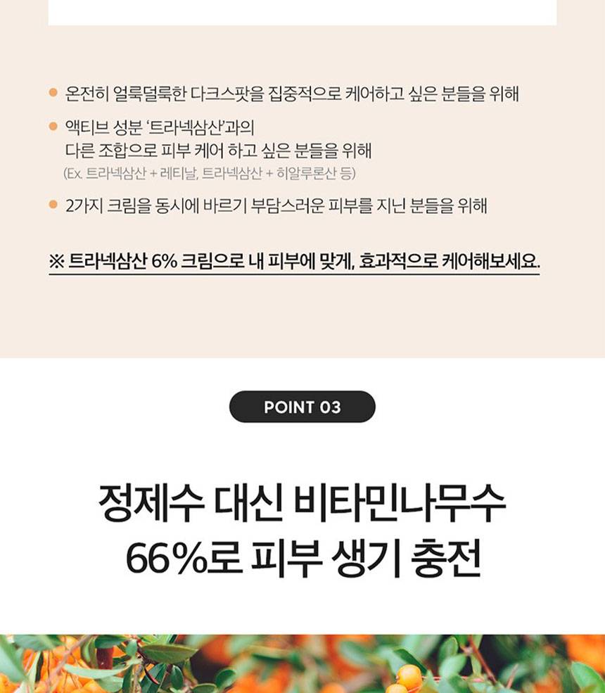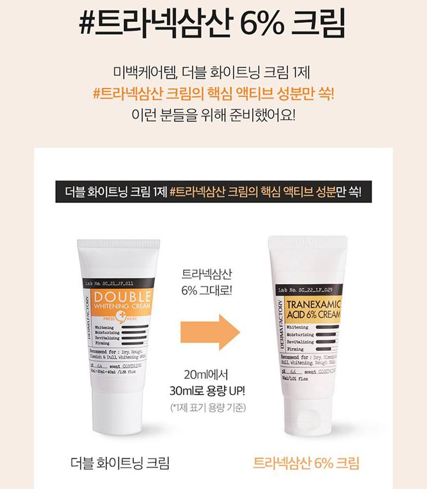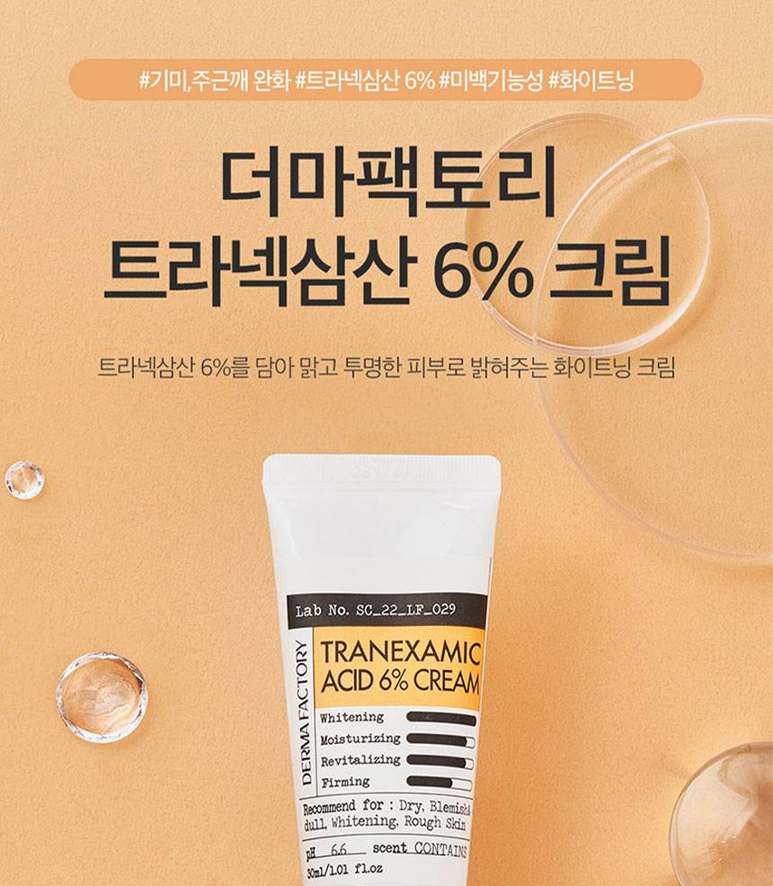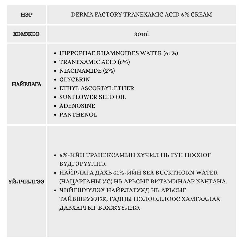 Транексамын хүчил 6% агуулсан энэхүү тос нь меланин үүсэхийг зогсоож, нөсөө толбыг багасгана. Derma Factory нь цэвэр усны оронд чацарганы ус ашигласнаараа илүү онцлогтой.
