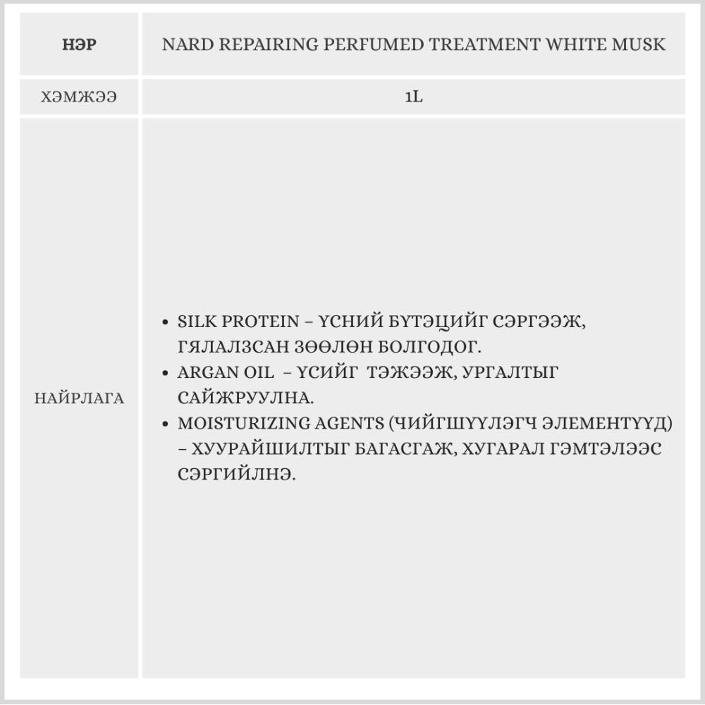 NARD REPAIRING PERFUMED TREATMENT WHITE MUSK, 1L / ҮСНИЙ АНГИЖРУУЛАГЧ /