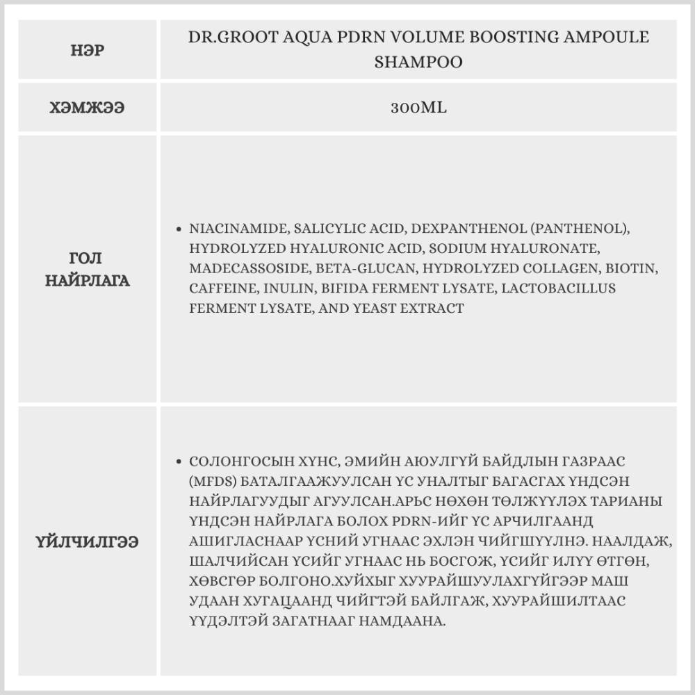 Энэхүү бүтээгдэхүүн нь үс уналтын эсрэг үйлчилгээгээрээ алдартай Dr.Groot брэндийн хамгийн сүүлийн үеийн технологиор бүтээгдсэн, үсэнд дээд зэргийн чийгшил өгөх зориулалттай шампунь.