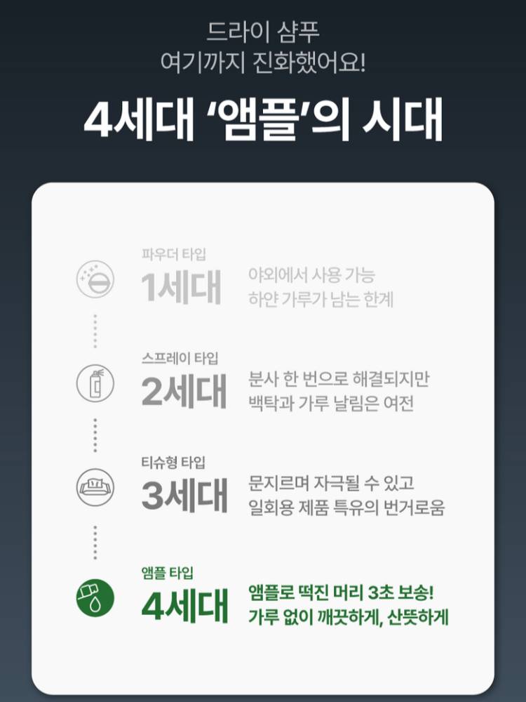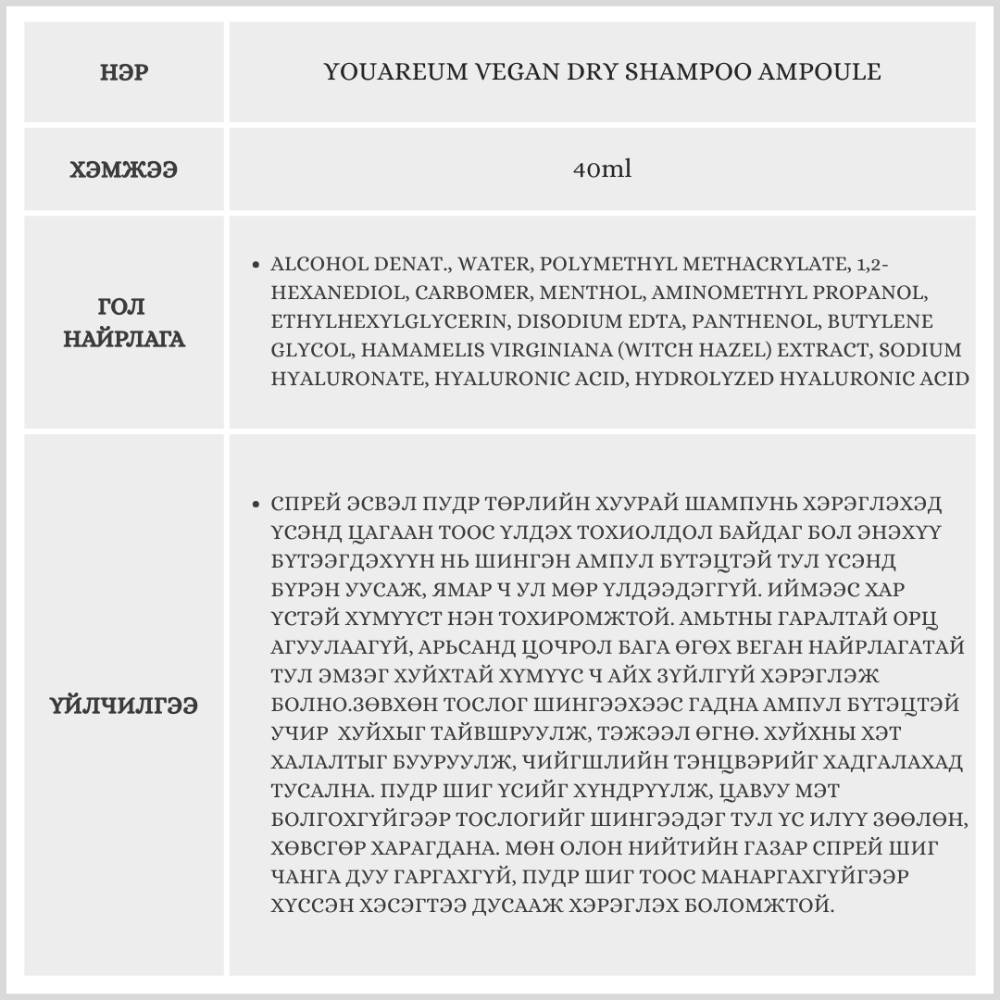 Энэхүү хуурай шампунь нь уламжлалт цацдаг спрей эсвэл пудр хэлбэрийн хуурай шампуниас тэс өөр, шингэн ампул бүтэцтэй шинэлэг бүтээгдэхүүн юм.