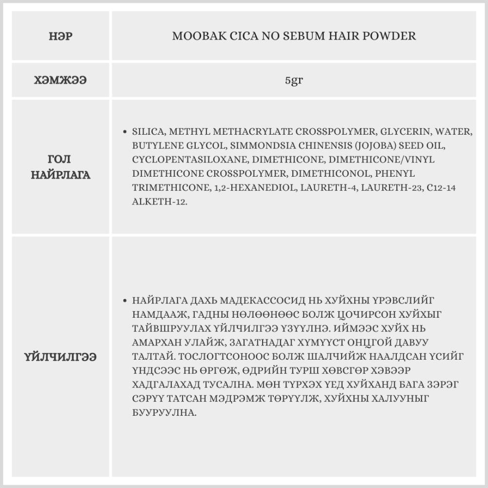 Энэхүү бүтээгдэхүүн нь үсний тослог дарах үйлчилгээг хуйхны арчилгаатай хослуулсан, маш зөөлөн найрлагатай хуурай шампунь юм. Хуйхны илүүдэл тослогийг агшин зуур шингээж, үсийг дөнгөж угаасан мэт цэвэрхэн, матт харагдуулна.