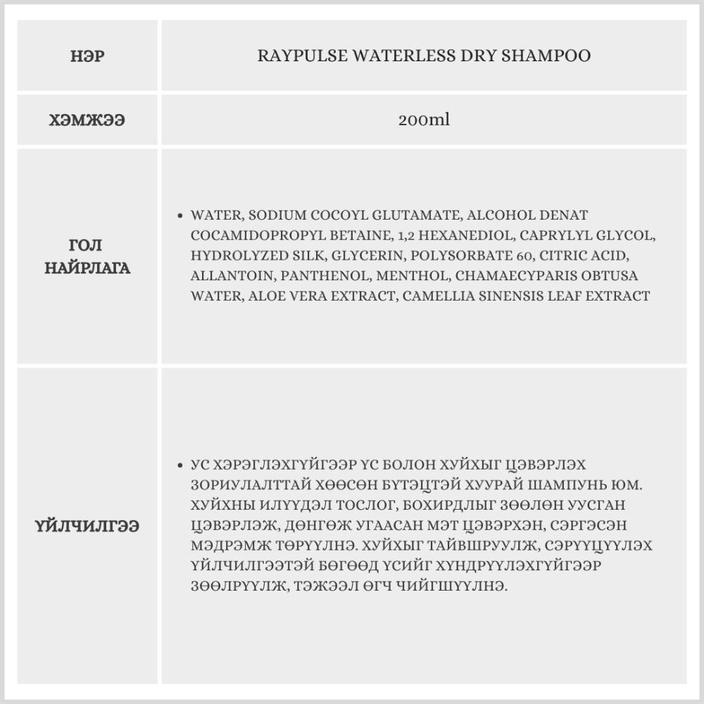 Усаар зайлах боломжгүй нөхцөлд үс болон хуйхыг цэвэрлэх зориулалттай, хөөсөн бүтэцтэй бүтээгдэхүүн юм. Үс болон хуйхыг зөөлөн цэвэрлэж, үсэнд тэжээл өгч, зөөлрүүлнэ.