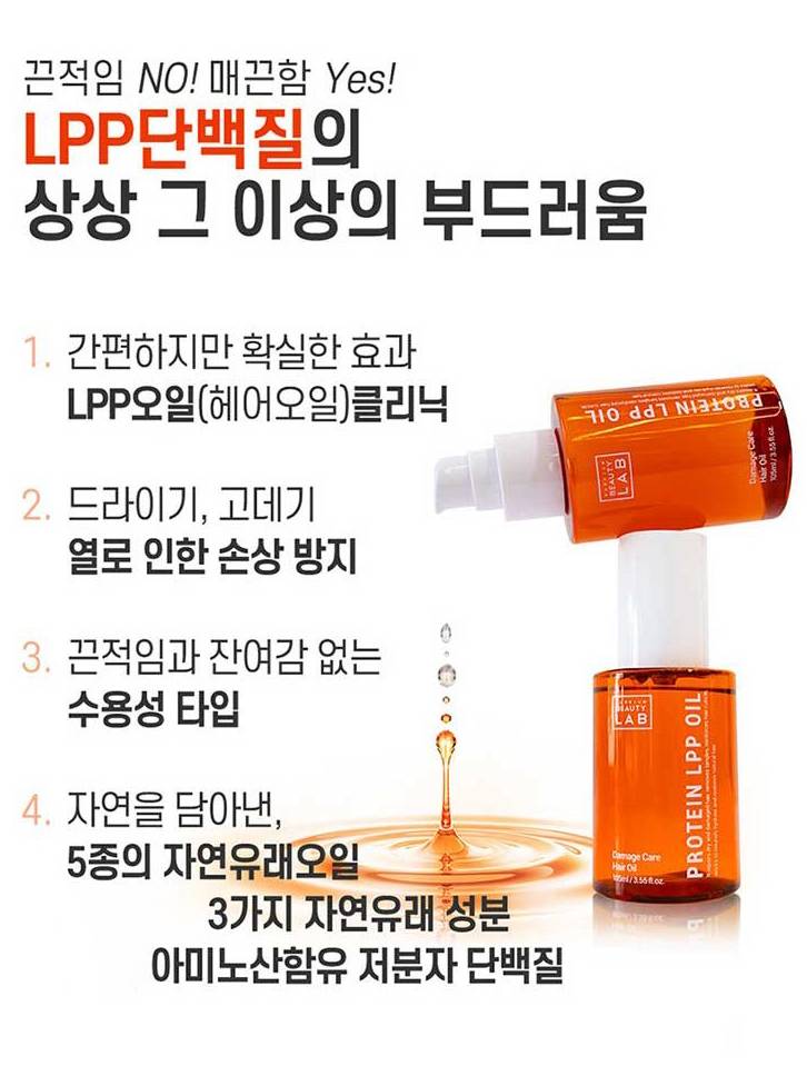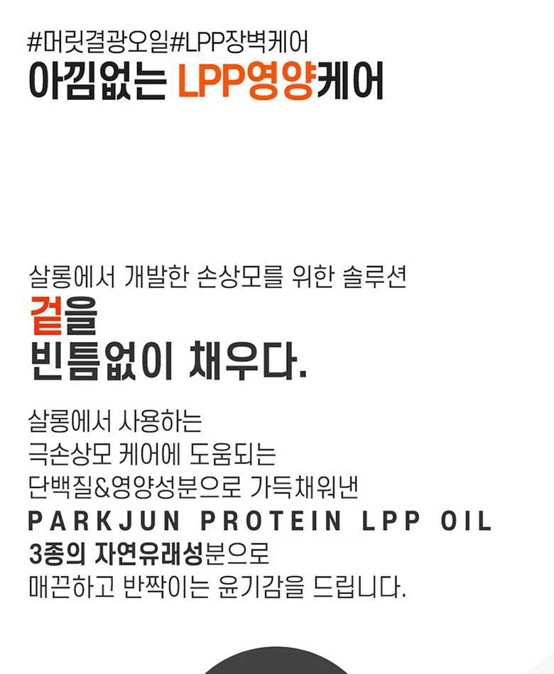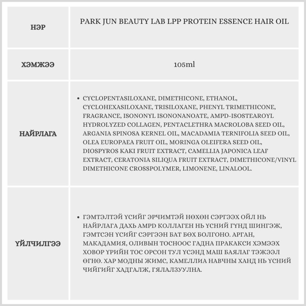 Park Jun Beauty Lab нь Солонгосын алдартай үсчин, гоо сайхны салоны брэнд юм. Энэхүү үсний тос нь үсний будаг, халуун индүү, сэнснээс болж гэмтсэн үсийг LPP уургийн тусламжтайгаар дотроос нь нөхөн сэргээж, гялалзсан зөөлөн болгоно.