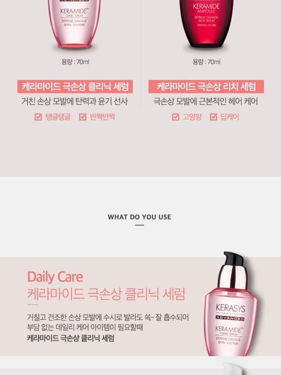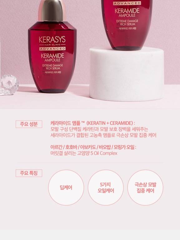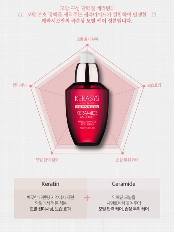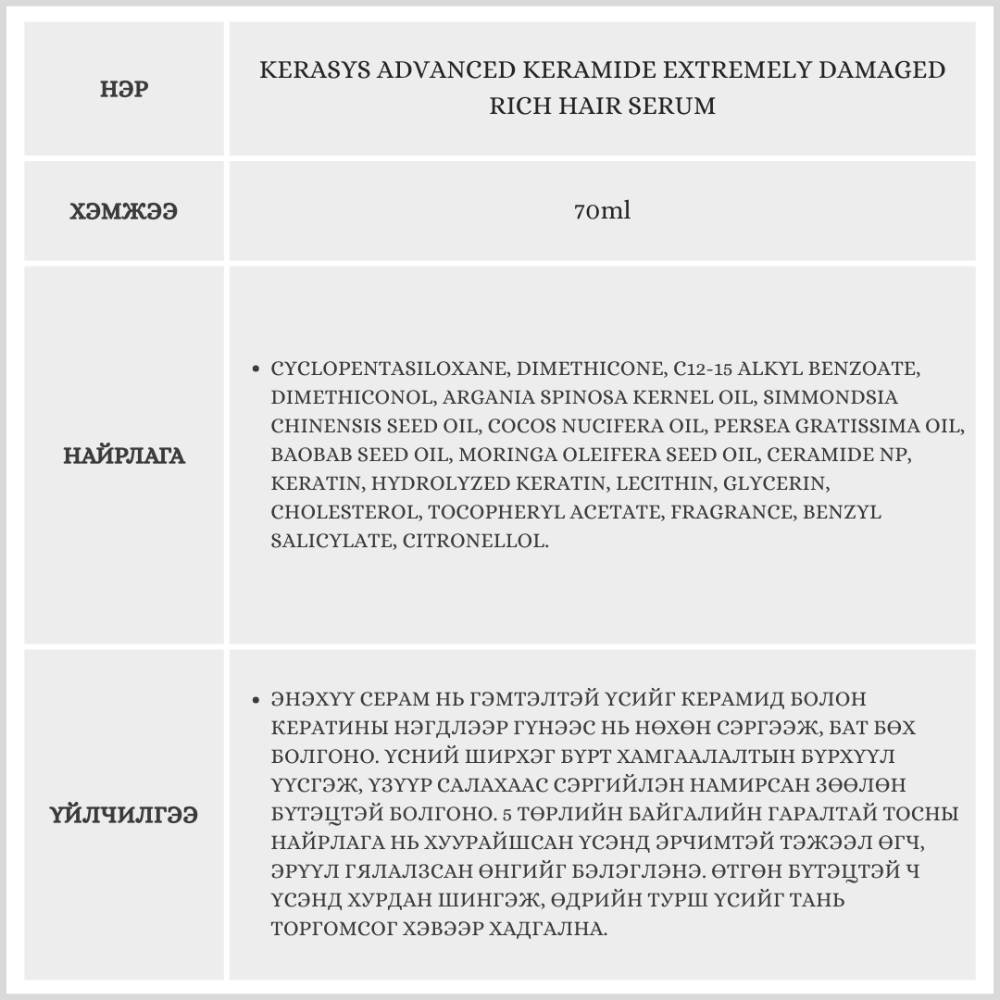 Энэхүү серум нь гэмтэлтэй үсэнд зориулсан эрчимтэй тэжээл өгөх үйлчилгээтэй. Үсний үндсэн бүтэц болох Кератин болон чийг түгжих Церамидыг нэгтгэсэн Keramide найрлагатай тул тасарч хугарсан үсийг гүнээс нь нөхөн сэргээж, үсний үзүүр салахаас сэргийлнэ.