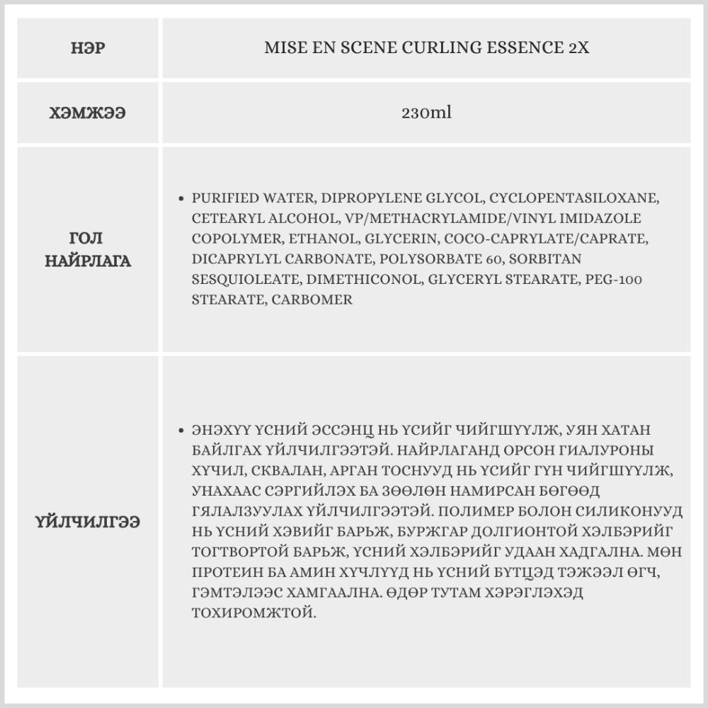 Энэхүү бүтээгдэхүүн нь үсний долгион, буржгар хэвийг барих, үсийг уян хатан байлгах, үсийг үөөлрүүлэх зэрэг олон үйлчилгээтэй үсний эссэнц юм. Үсийг чийгшүүлж, гялалзсан болгох ба долгионтой болон буржгар үс, буржгар химитэй үсэнд тохиромжтой.