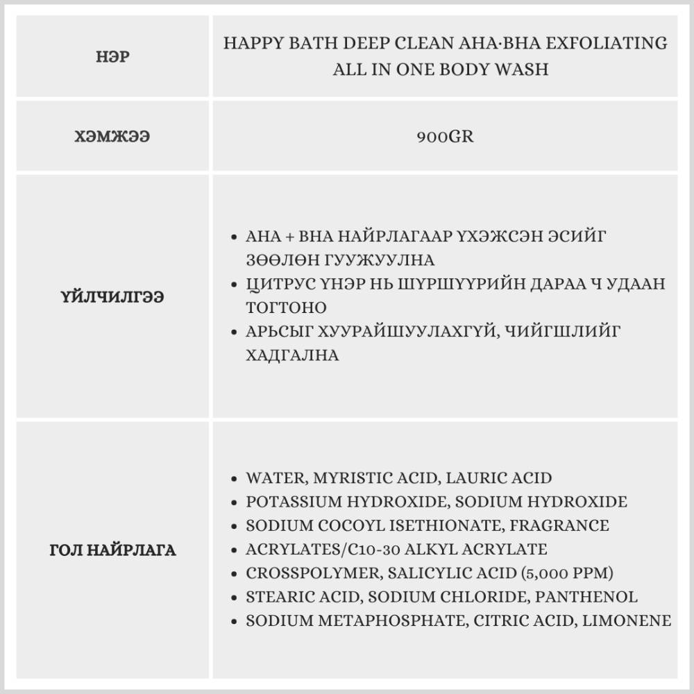 AHA болон BHA найрлага нь биеийн үхэжсэн эсийг зөөлөн гуужуулж, арьсны барзгар хэсгийг толигор болгоно. Хөөсөрхөг, зөөлөн бүтэцтэй тул арьсыг хуурайшуулахгүйгээр бохирдлыг гүн цэвэрлэнэ.