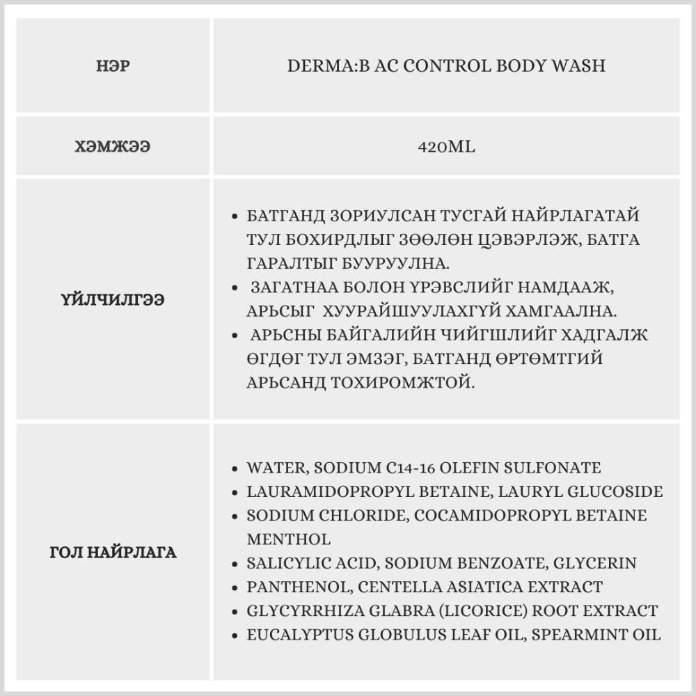 Биеийн батга болон үрэвслийг намдаах байгалийн гаралтай орцууд нь арьсыг гүн цэвэрлэж, тайвшруулах үйлчилгээтэй. Зөөлөн бүтэцтэй хөөс нь арьсны чийгийг хадгалж, хуурайшуулахгүй тул эмзэг болон батга их гардаг хүмүүст нэн тохиромжтой.