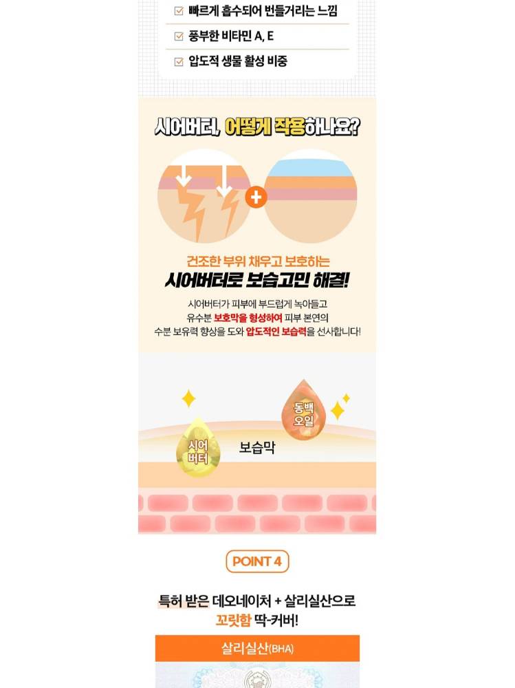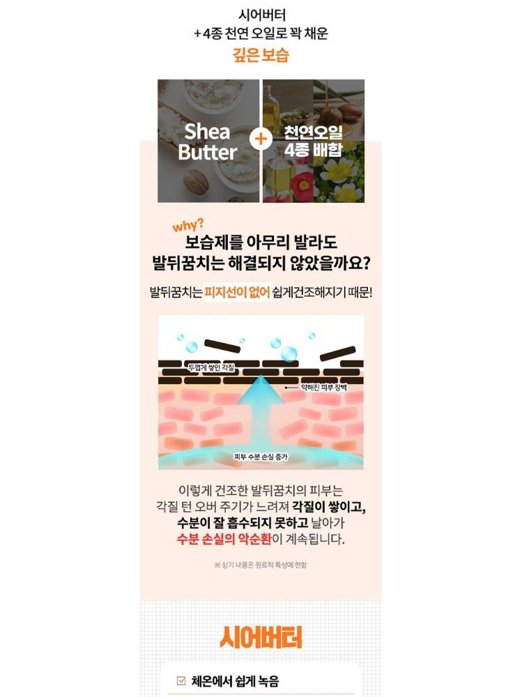 Хатуурч, хуурайшсан өсгийг өвдөлтгүйгээр зөөлрүүлж, толигор болгоно. Стик хэлбэрийн загвар нь хэзээ ч хаана ч хэрэглэхэд хялбар. Шим тэжээллэг найрлага нь арьсыг гүн чийгшүүлж хамгаалана.