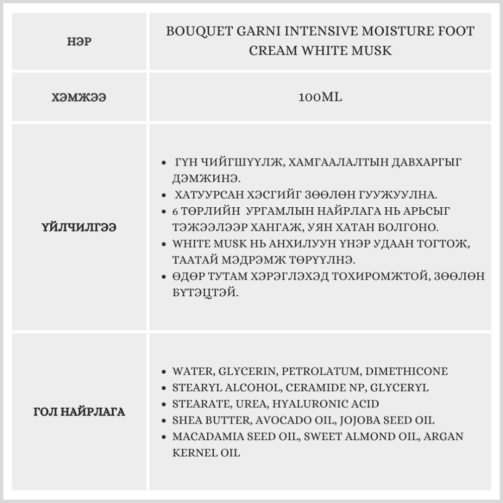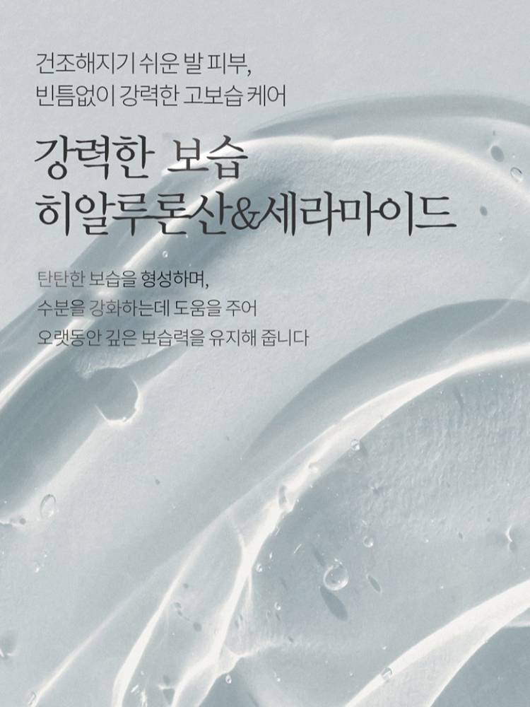 Хөлийн хуурайшилтыг намдааж, зөөлөн толигор болгоно. Гиалуроны хүчил болон керамидийн нэгдэл нь арьсыг гүн чийгшүүлж, хамгаалалтын давхаргыг бэхжүүлнэ.