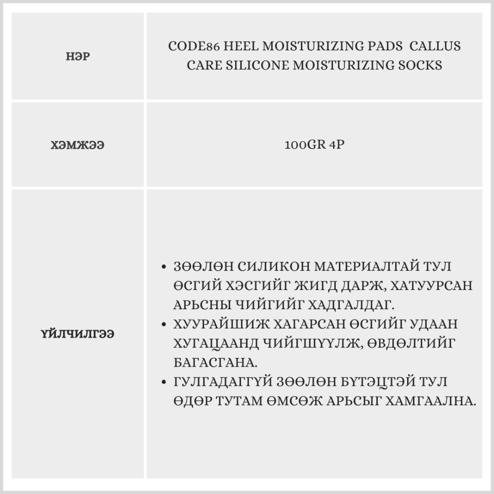 Зөөлөн силикон материалтай тул өсгий хэсгийг жигд дарж, хатуурсан арьсны чийгийг хадгалдаг. Хуурайшиж хагарсан өсгийг удаан хугацаанд чийгшүүлж, өвдөлтийг багасгана.