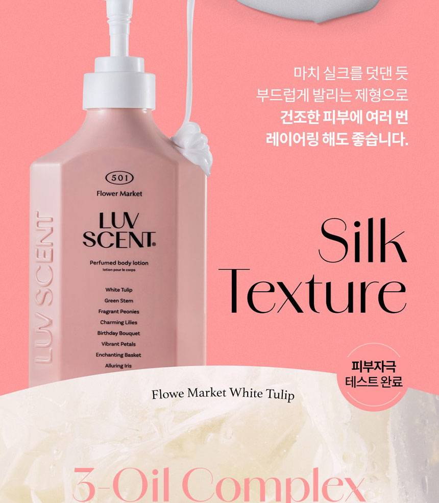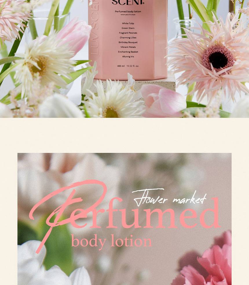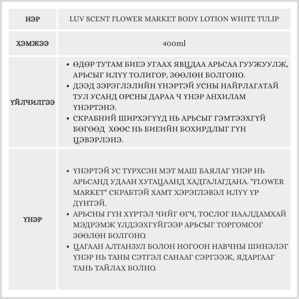 "Flower Market" буюу цэцгийн дэлгүүрт орох үед мэдрэгддэг тэрхүү шинэлэг, шүүдэрлэг цэцэгсийн үнэрийг арьсанд тань шингээнэ. Хөнгөн бүтэцтэй тул арьсанд хурдан шингэж, өдрийн турш арьсыг зөөлөн, чийглэг бөгөөд анхилуун үнэртэй байлгана.