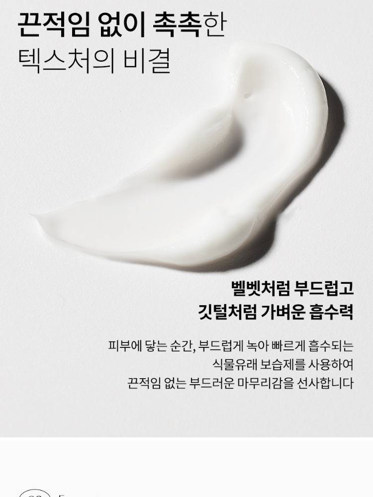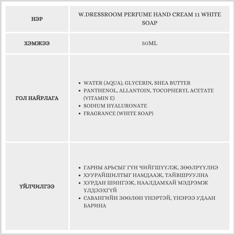 Энэхүү бүтээгдэхүүн нь цагаан савангийн үнэртэй бөгөөд үнэрээ удаан барина. Арьсыг гүн чийгшүүлж, наалдамхай мэдрэмж үлдээхгүй хөнгөн бүтэцтэй.