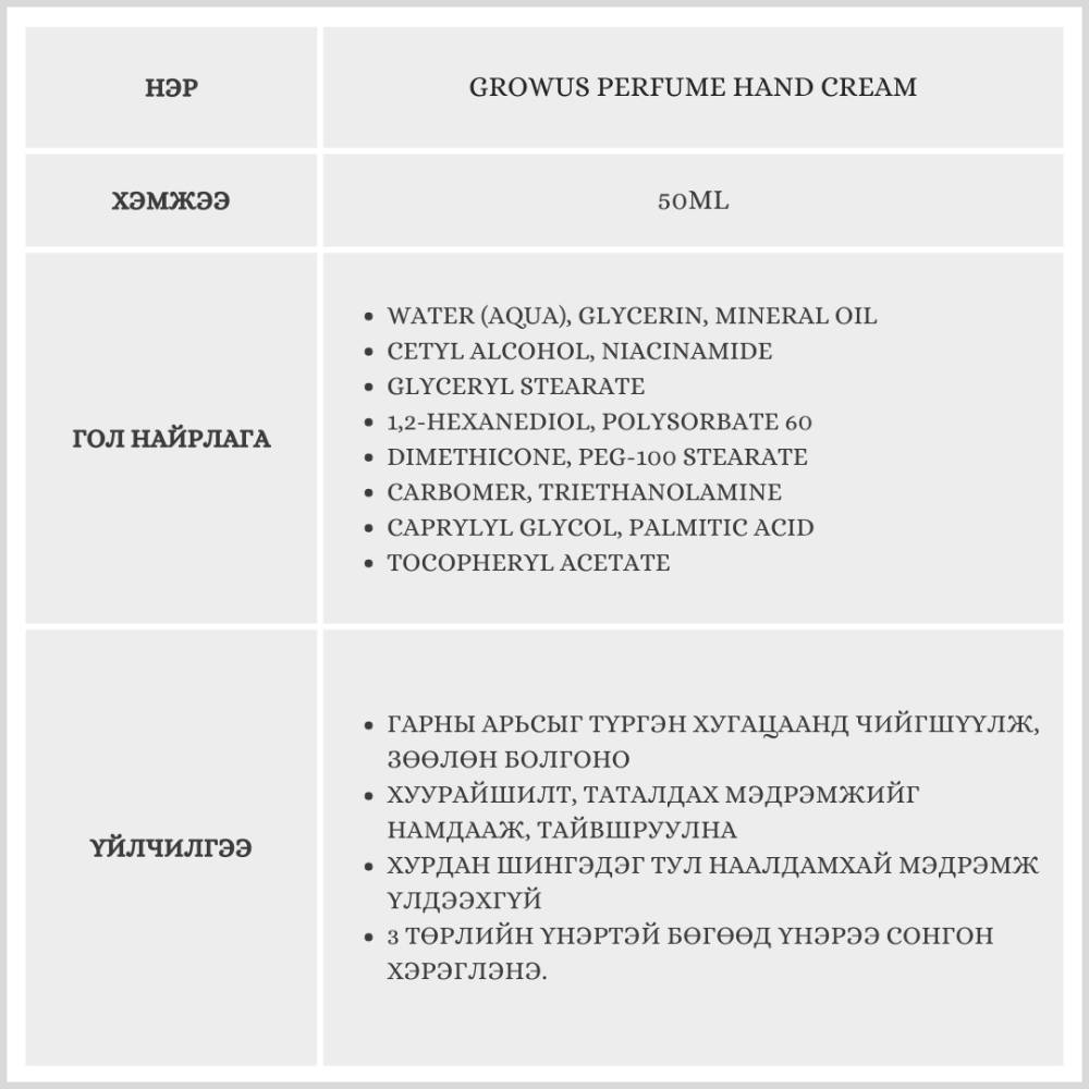 Growus Perfume Hand Cream, 50 ml 3 Types /Гарын тос/