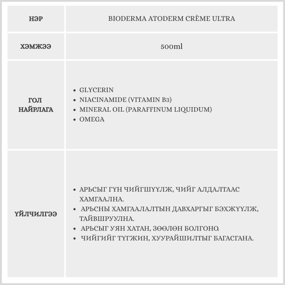 Энэхүү бүтээгдэхүүн нь арьсны тест хийгдсэн, үнэргүй.Арьсыг гүн чийгшүүлж, тайвшруулан, арьсны хамгаалалтын давхаргыг бэхжүүлнэ.