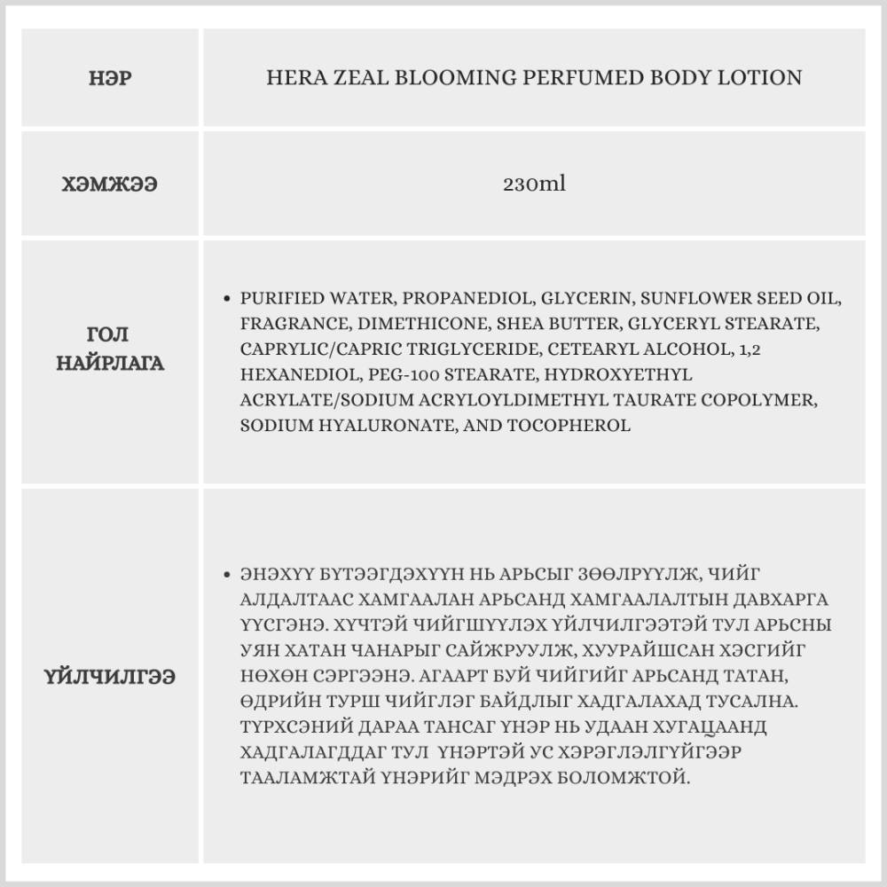 Энэхүү бүтээгдэхүүн нь дээд зэрэглэлийн үнэртэй ус болон биеийн тосыг хослуулсан арьс арчилгааны бүтээгдэхүүн юм. Арьсыг гүн чийгшүүлж, тайвшруулахын зэрэгцээ тансаг үнэрээ удаан хугацаанд хадгалдгаараа онцлогтой.