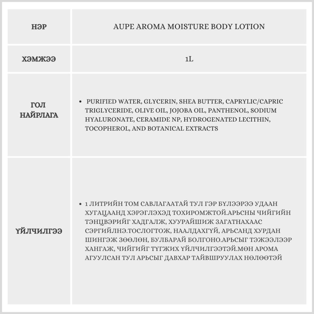 Энэхүү бүтээгдэхүүн нь арьсыг гүн чийгшүүлэх үйлчилгээтэй, анхилуун үнэртэй лосьон юм.Цагаан заартны хэт хурц биш, цэвэрхэн дулаахан мэдрэмж төрүүлэх үнэртэй бөгөөд үнэрээ удаан барьдгаараа онцлог.