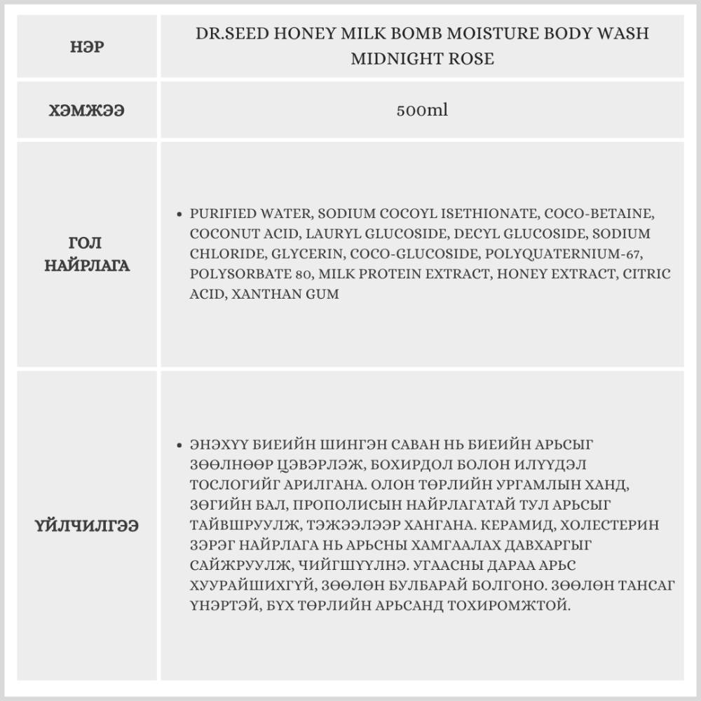 Энэхүү биеийн шингэн саван нь арьсыг зөөлөн цэвэрлэж, чийгшүүлж тэжээл өгөх үйлчилгээтэй. Зөгийн бал, сүүний найрлага нь арьсыг булбарай зөөлөн болгоно. Midnight Rose үнэр нь тайвшруулах, тансаг мэдрэмж төрүүлнэ.