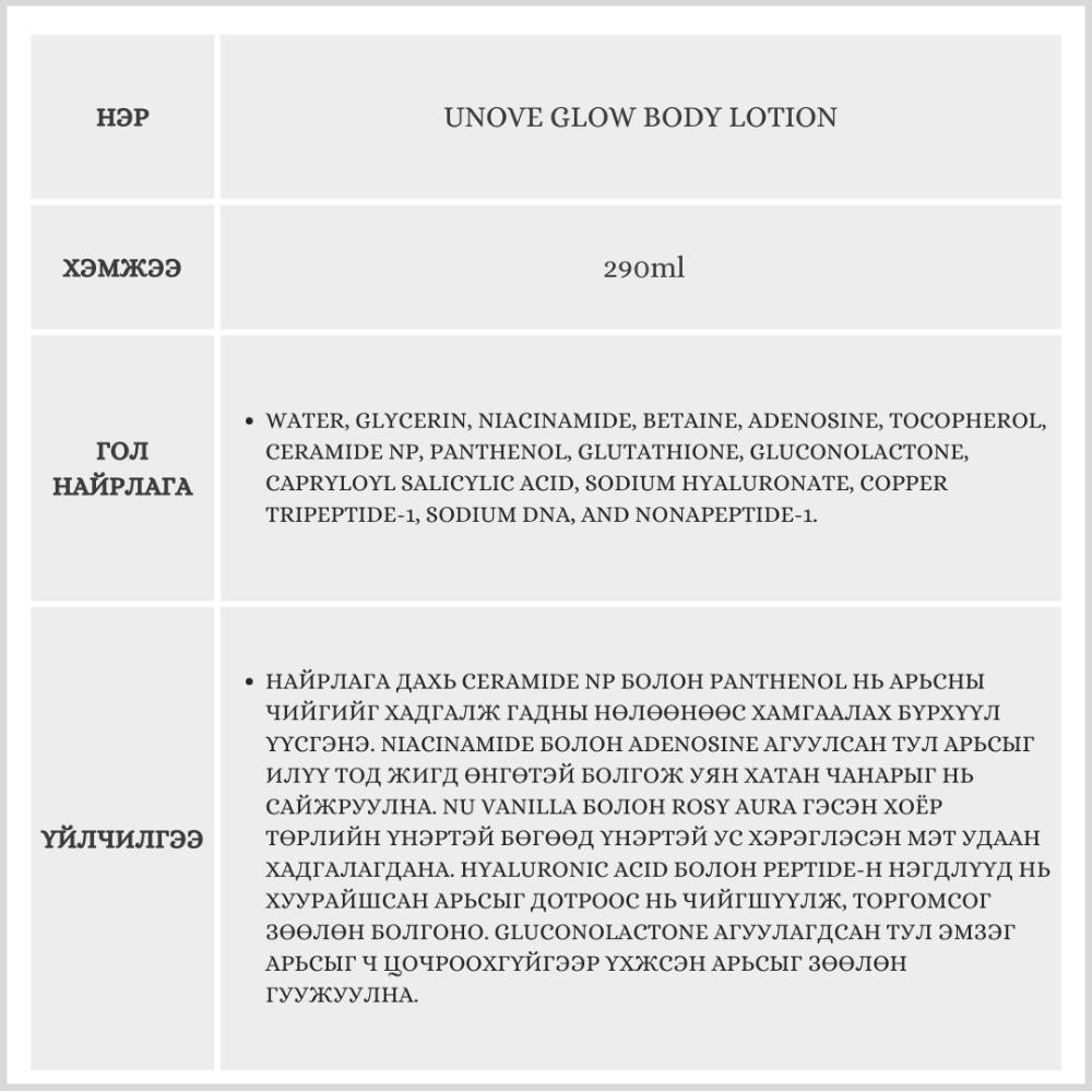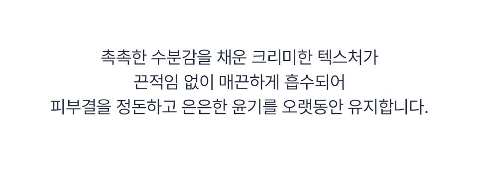 Энэхүү биеийн тос нь арьсыг гүн чийгшүүлж, үнэртэй ус мэт тансаг үнэрийг удаан хадгална. Найрлага дахь найман төрлийн гиалуроны хүчил болон пептид нь арьсыг цайруулж, үрчлээний эсрэг үйлчилгээ үзүүлнэ.