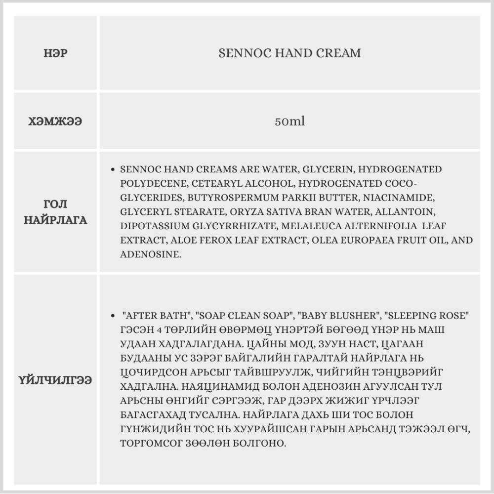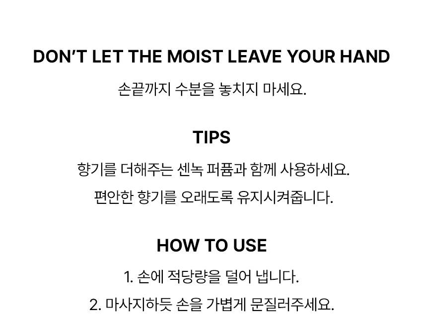 Энэхүү гарны тос нь арьсыг цайруулах үйлчилгээтэйгээс гадна үнэртэй ус хэрэглэсэн мэт анхилам үнэртэй. Байгалийн гаралтай найрлагаар баялаг тул эмзэг арьсанд ч тохиромжтой бөгөөд гарыг өдрийн турш зөөлөн чийглэг байлгахад тусална.
