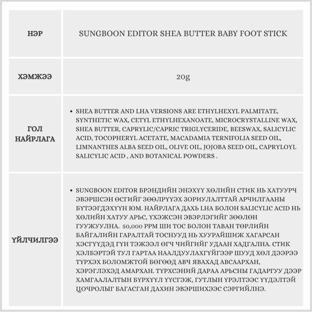 Энэхүү бүтээгдэхүүн нь хөлийн өсгий болон тавхайн хатуу хуурай арьс эвэрлэгийг зөөлөн болгох зориулалттай. Стик хэлбэртэй тул гартаа хүргэлгүйгээр хялбар түрхэх боломжтой бөгөөд Ши тос болон байгалийн тоснуудын тусламжтайгаар гүн чийгшил өгнө.
