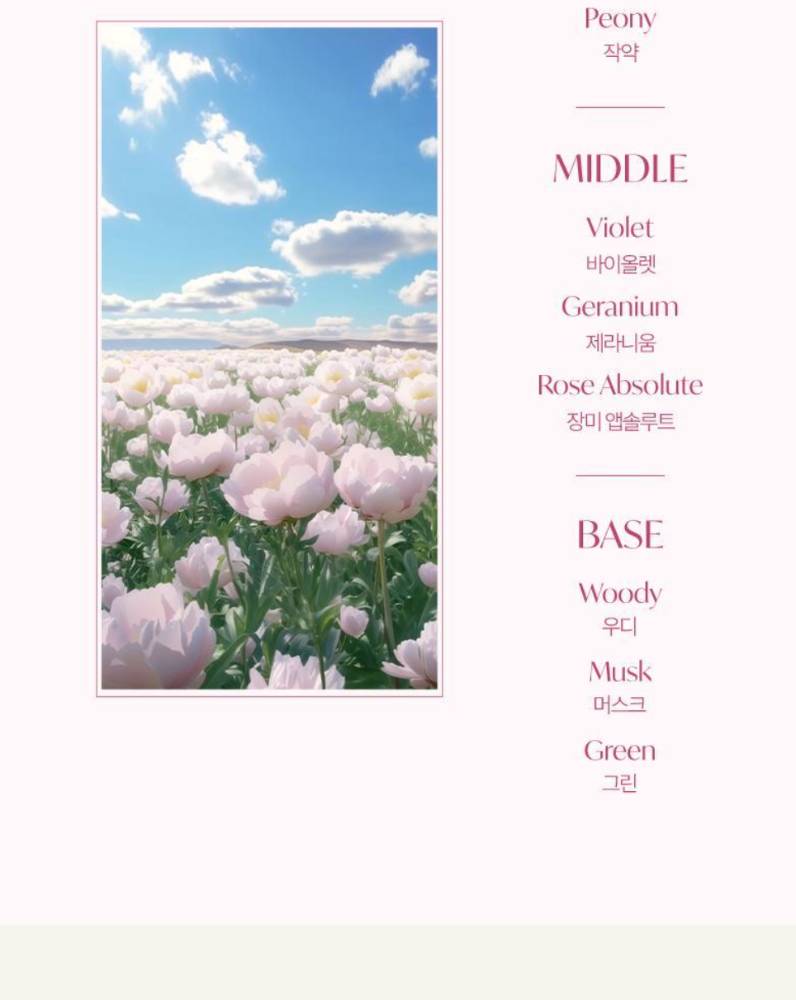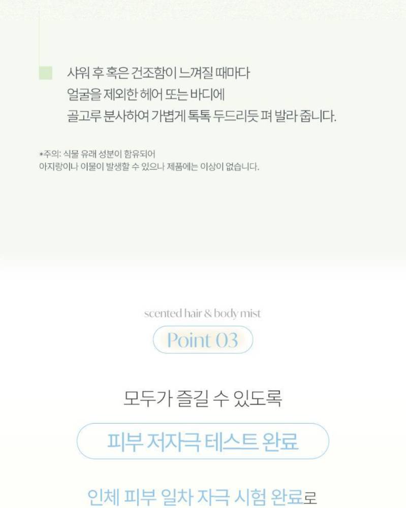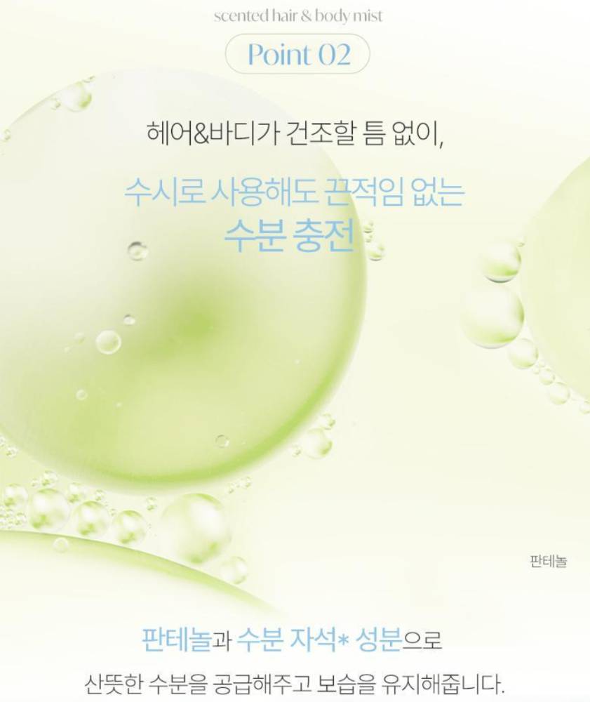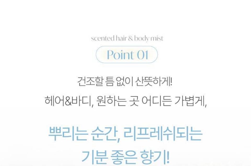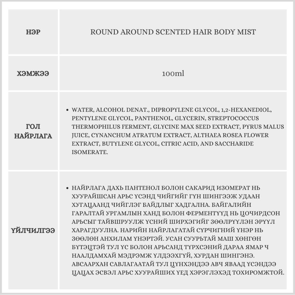 Энэхүү мист нь үс болон биеийн арьсанд зэрэг хэрэглэж болох бүтээгдэхүүн юм. Арьсыг гүн чийгшүүлэхээс гадна зөөлөн тааламжтай анхилуун үнэрийг удаан хугацаанд хадгална.