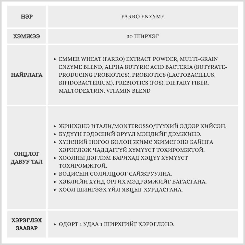 Жинхэнэ Итали /Monterosso/ түүхий эдээр хийсэн, бүдүүн гэдэсний эрүүл мэндийг дэмжих уураг, өөх тос, нүүрс усыг задлагч.