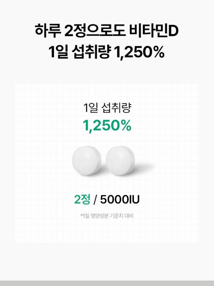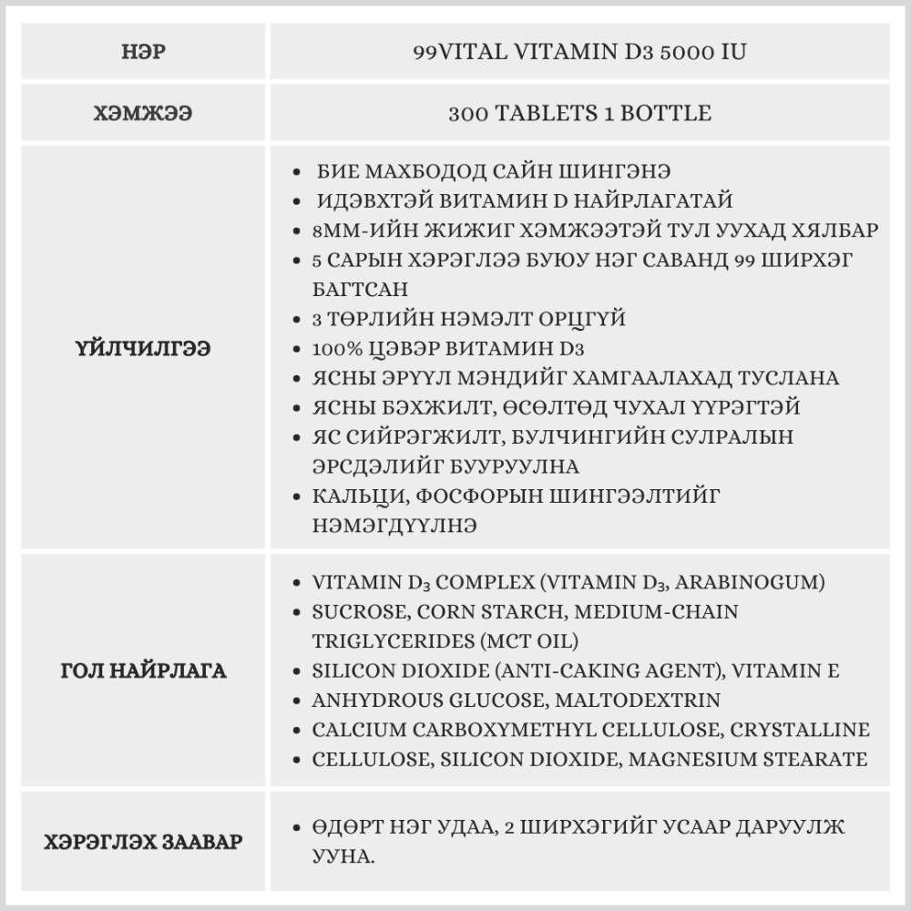 Биед шингэх шингэлт өндөр бөгөөд 5000 IU тунгаар агуулсан тул яс, булчингийн эрүүл мэндийг дэмжинэ. 8мм-ийн жижиг хэмжээтэй шахмал учир уухад хялбар. 5 сарын хэрэглээг багтаасан.
