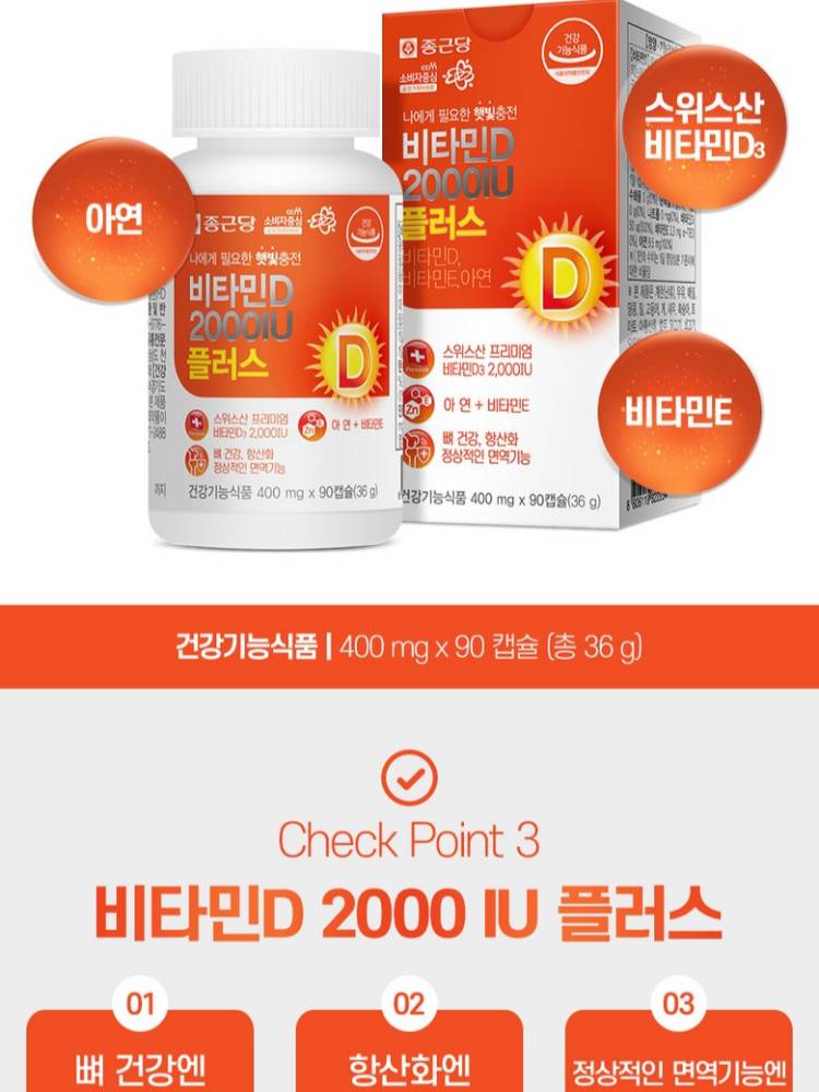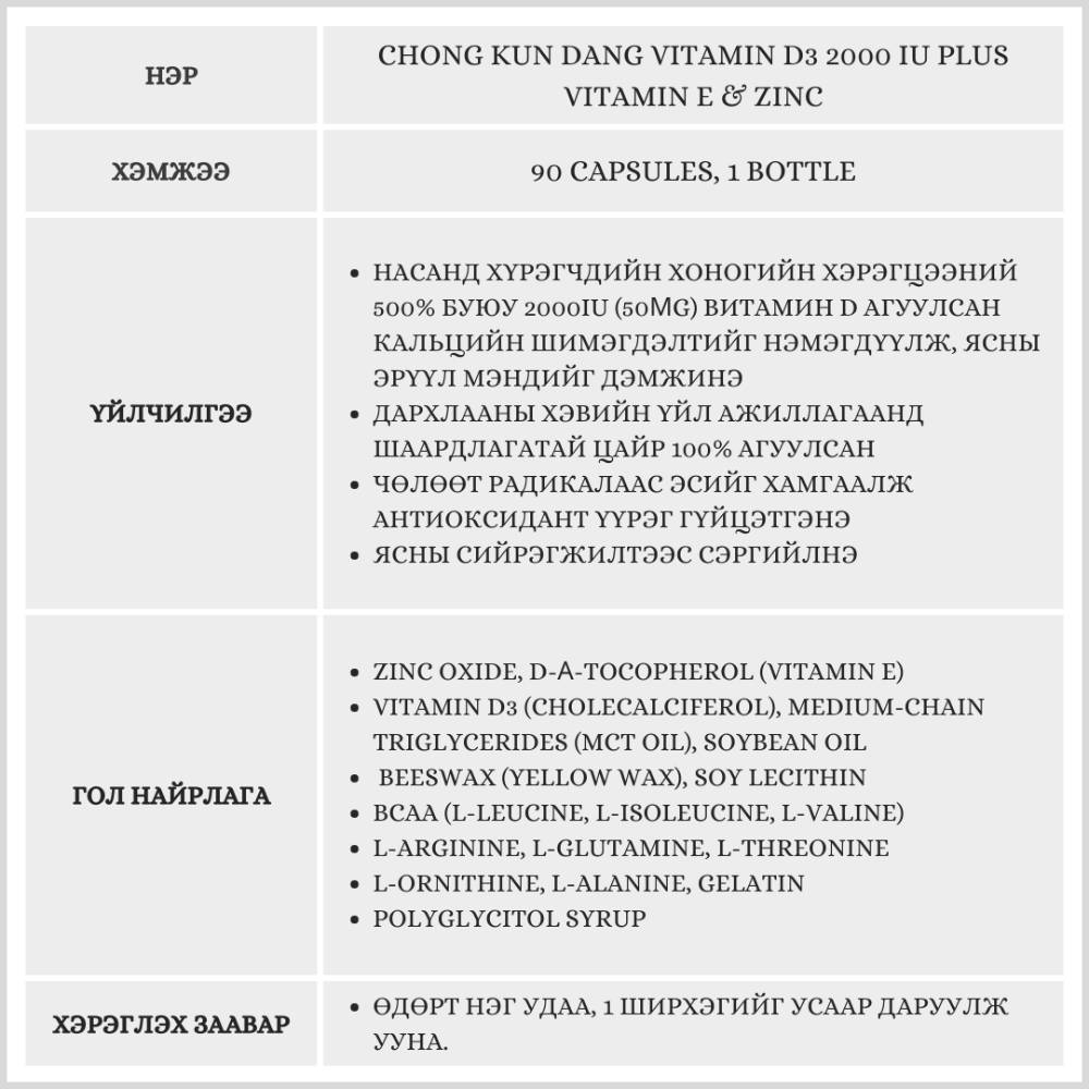Насанд хүрэгчдийн хоногийн хэрэгцээний 500% буюу 2000IU витамин D агуулсан Кальцийн шимэгдэлтийг нэмэгдүүлж, ясны эрүүл мэндийг дэмжинэ.
