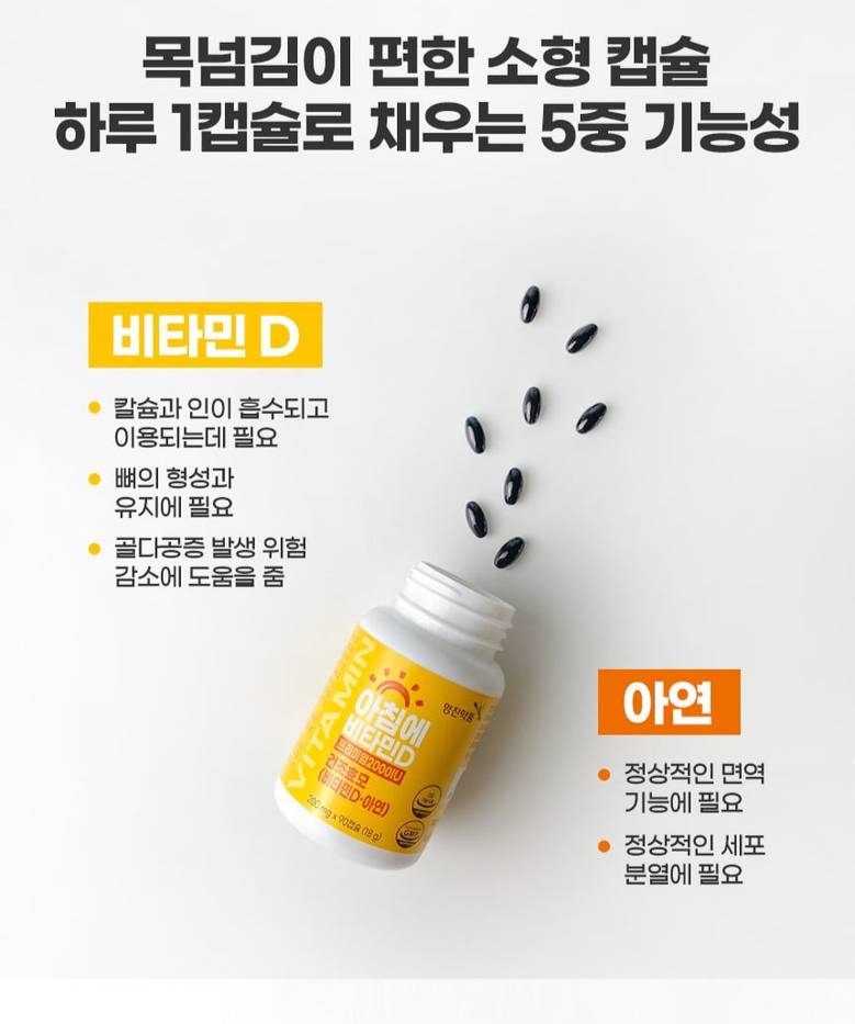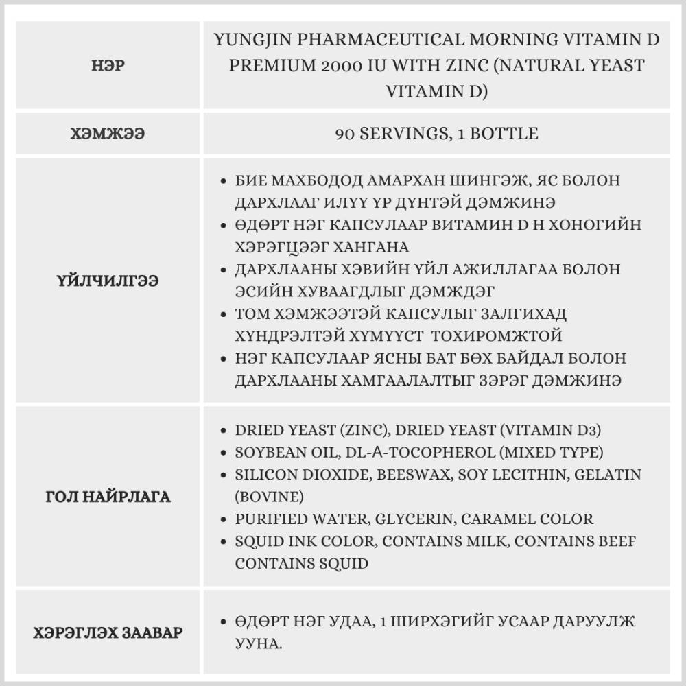 Бие махбодод сайн шингэдэг, өндөр чанарын витамин D3 ба цайрыг агуулснаар ясны эрүүл мэндийг хамгаалж, дархлааг дэмжинэ. Жижигхэн капсултай тул уухад хялбар бөгөөд өдөр тутмын хэрэглээнд тохиромжтой.Мөн хэрэггүй хиймэл нэмэлт орц ороогүй цэвэр найрлагатайгаараа давуу талтай.