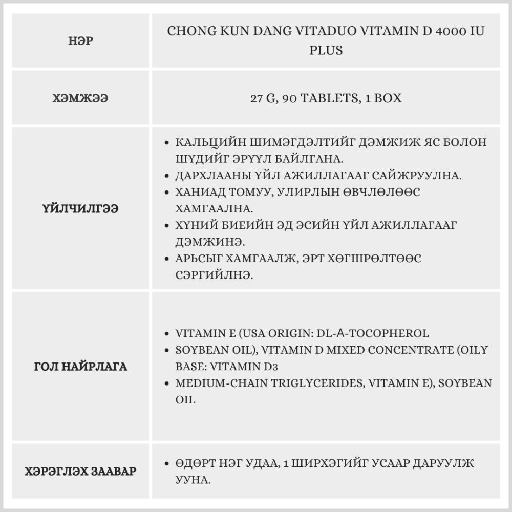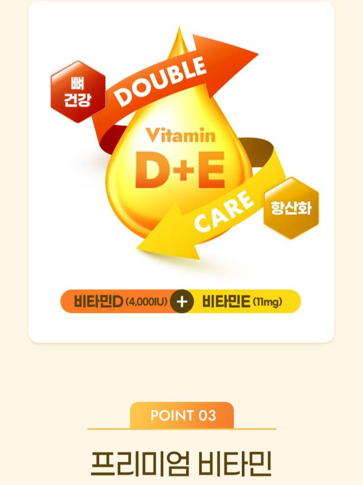 D витамин яс, дархлааг дэмжих бол E витамин антиоксидант үйлчилгээтэй арьсыг хамгаалж, эрт хөгшрөлтөөс сэргийлнэ.Насанд хүрэгчид, өсвөр насныхан, жирэмсэн ба хөхүүл эхчүүд ч хэрэглэх боломжтой.