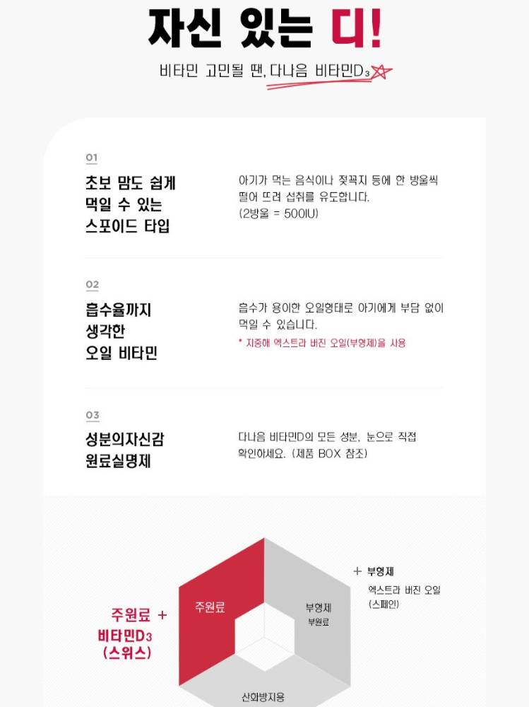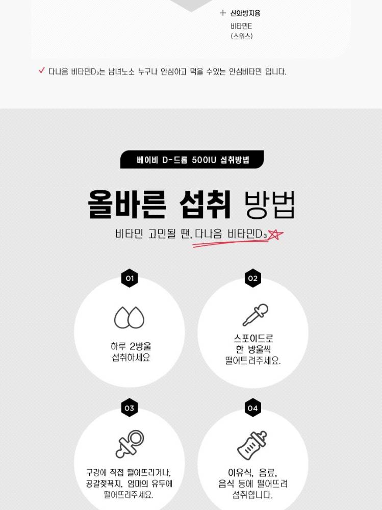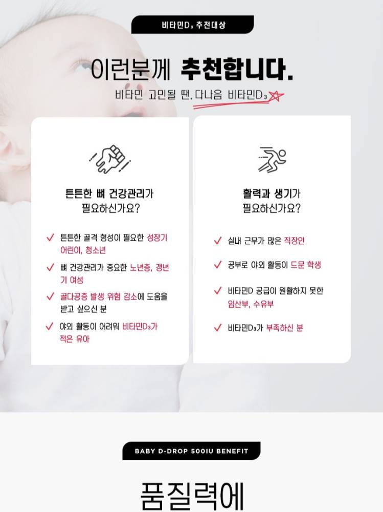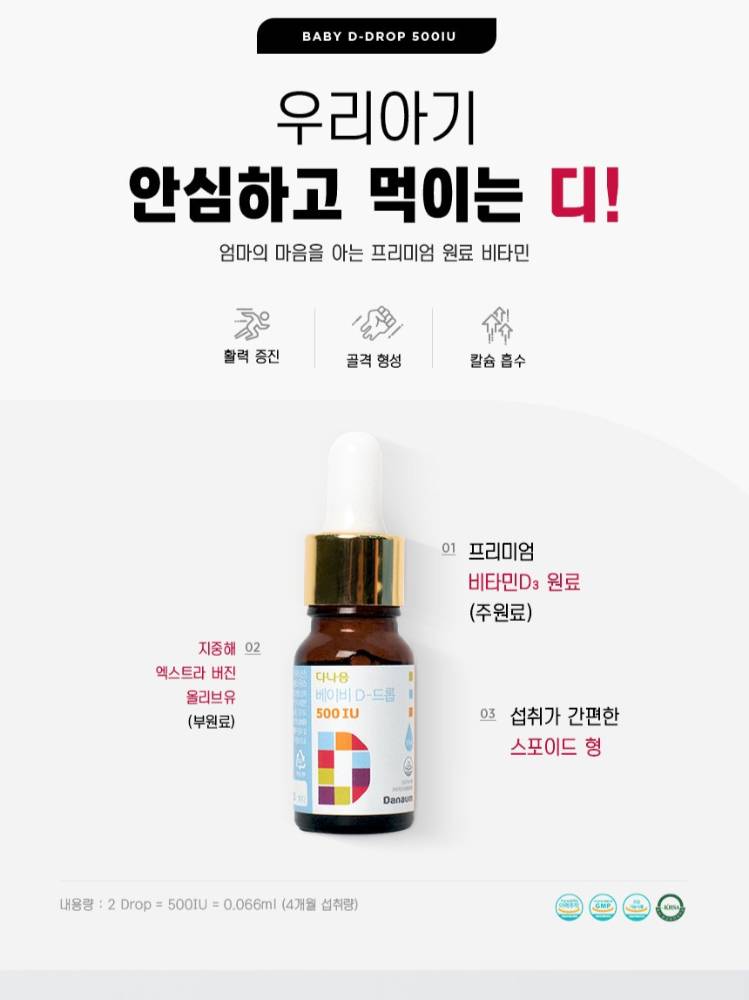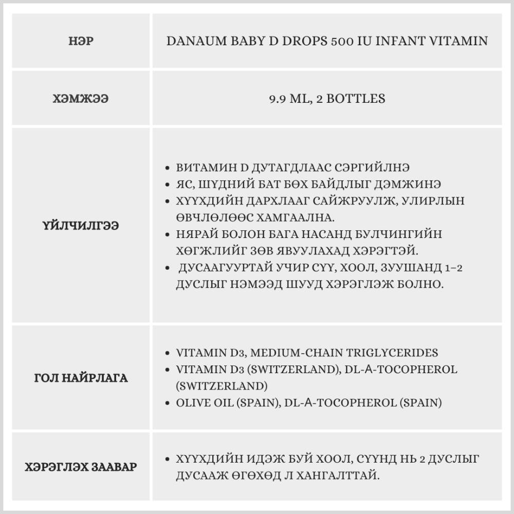 Бага насны хүүхдээс эхлээд насанд хүрэгчид хүртэл хэрэглэх боломжтой. Өдөрт авах шаардлагатай D витаминыг дусаалга хэлбэрээр хялбар авах боломжтой бүтээгдэхүүн. Бие махбодод шимэгдэлт сайтай бөгөөд ясны өсөлт болон дархлааг дэмжинэ.