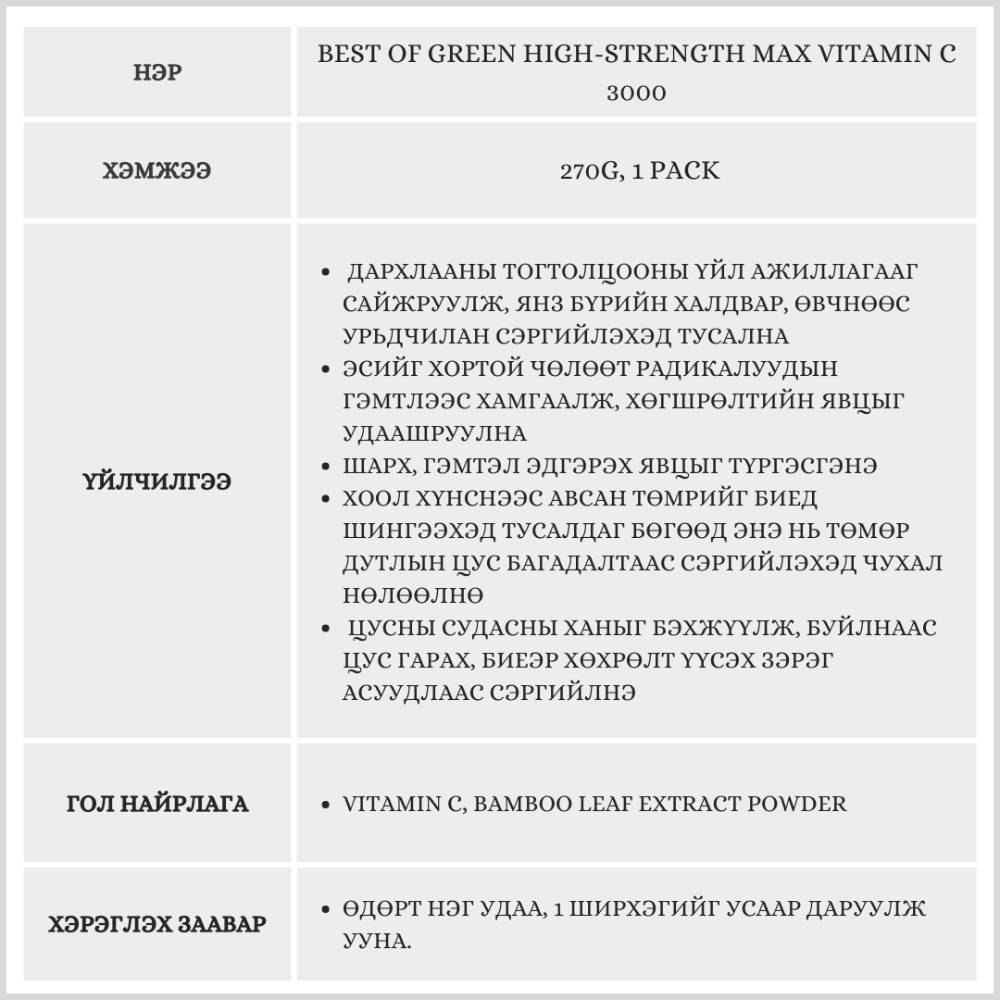 Витамин С нь дархлааг дэмжих, коллаген нийлэгжүүлэх, шархыг эдгээх зэрэг маш олон чухал үүрэгтэй, хүчтэй антиоксидант. Төмрийн шимэгдэлтийг сайжруулж, эсийг чөлөөт радикалаас хамгаална.Витамин С-г бие өөрөө нийлэгжүүлдэггүй тул бид түүнийг гаднаас тогтмол авч байх хэрэгтэй.