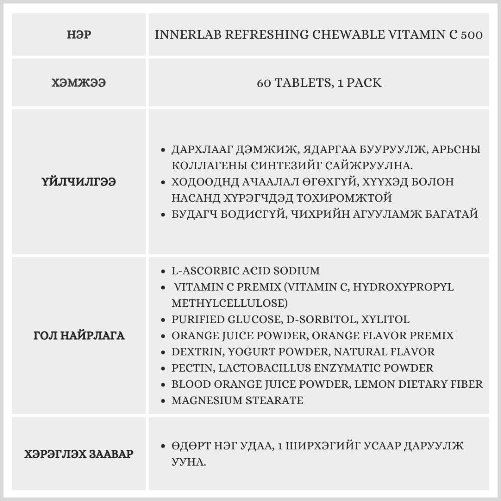 Өндөр чанарын Витамин C болон жинхэнэ жүржийн найрлага нь өдөр тутмын дархлаа болон энергийг дэмжинэ. Зөөлөн, жүржийн амттай тул хүүхэд ч уух дуртай. Өдөрт нэг ширхгээр хэрэглэхэд л арьсны эрүүл байдал болон дархлааг дэмжинэ.