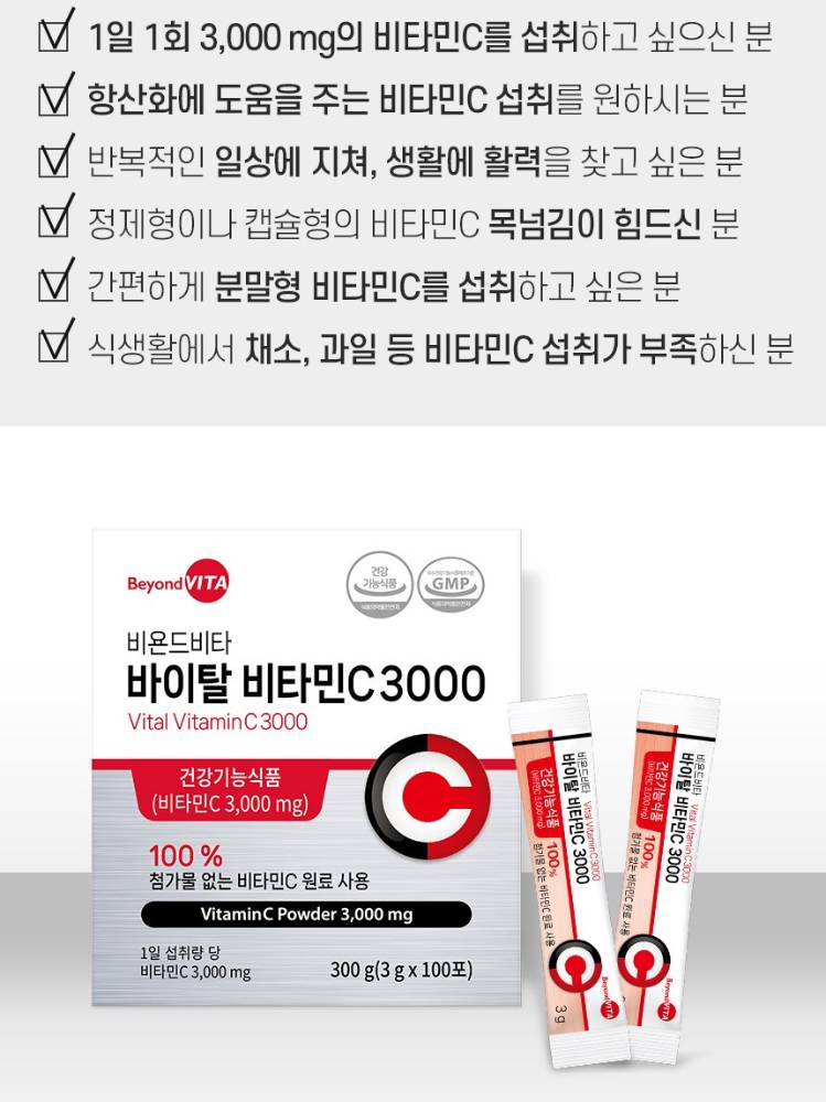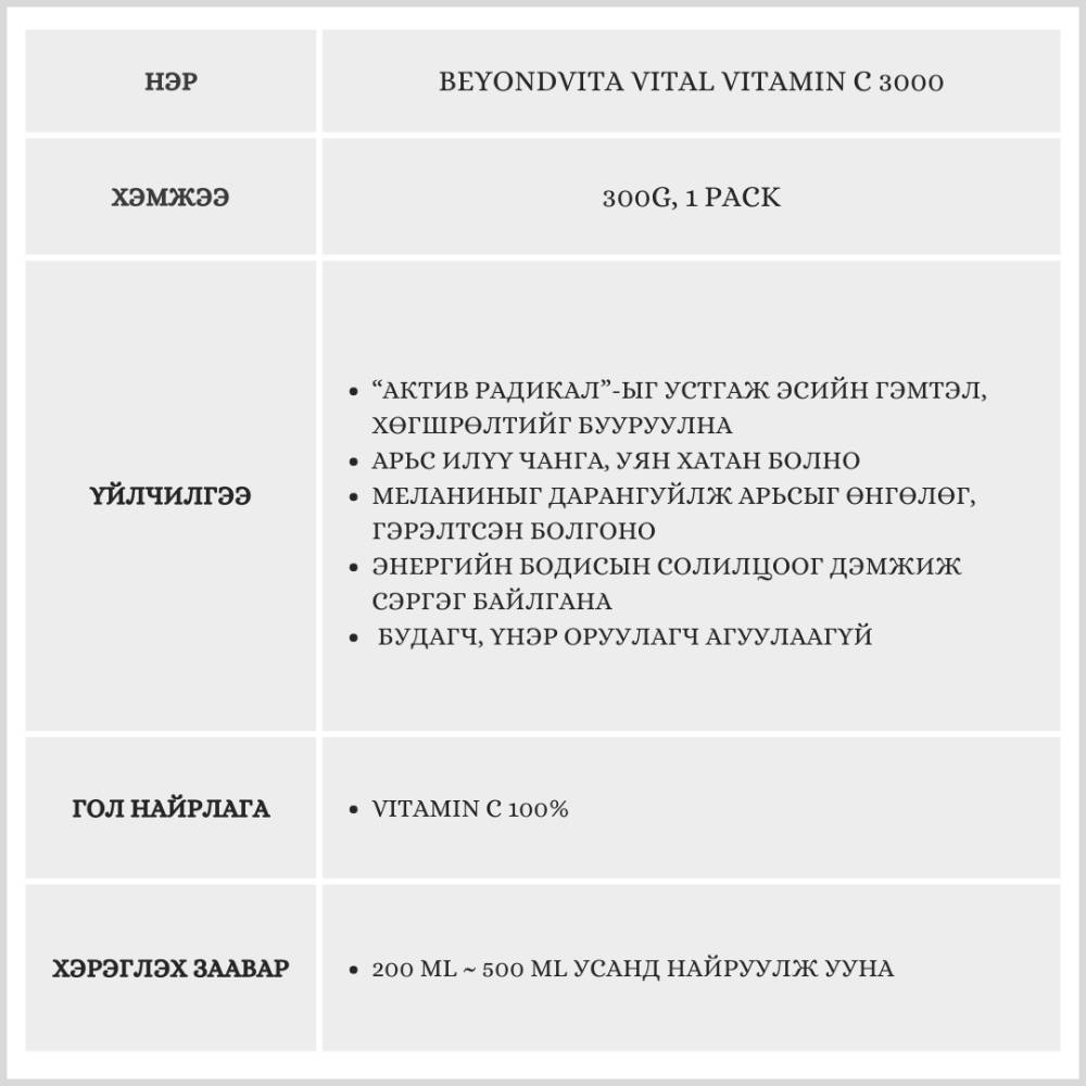 Энэхүү бүтээгдэхүүн нь элдэв химийн найрлага, хадгалалтын хугацаа уртасгагч бодисгүй, 100% цэвэр витамин C агуулсан. Дархлааг дэмжиж, арьсыг чангалах үйлчилгээтэй бөгөөд бодисын солилцоог идэвхжүүлнэ.