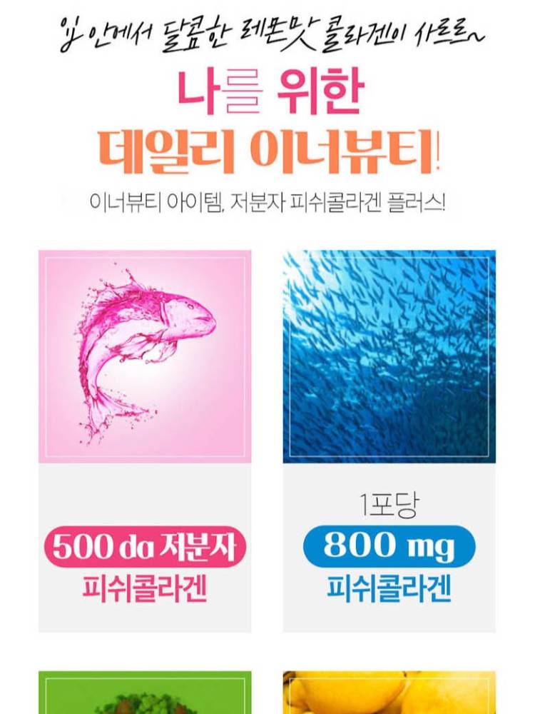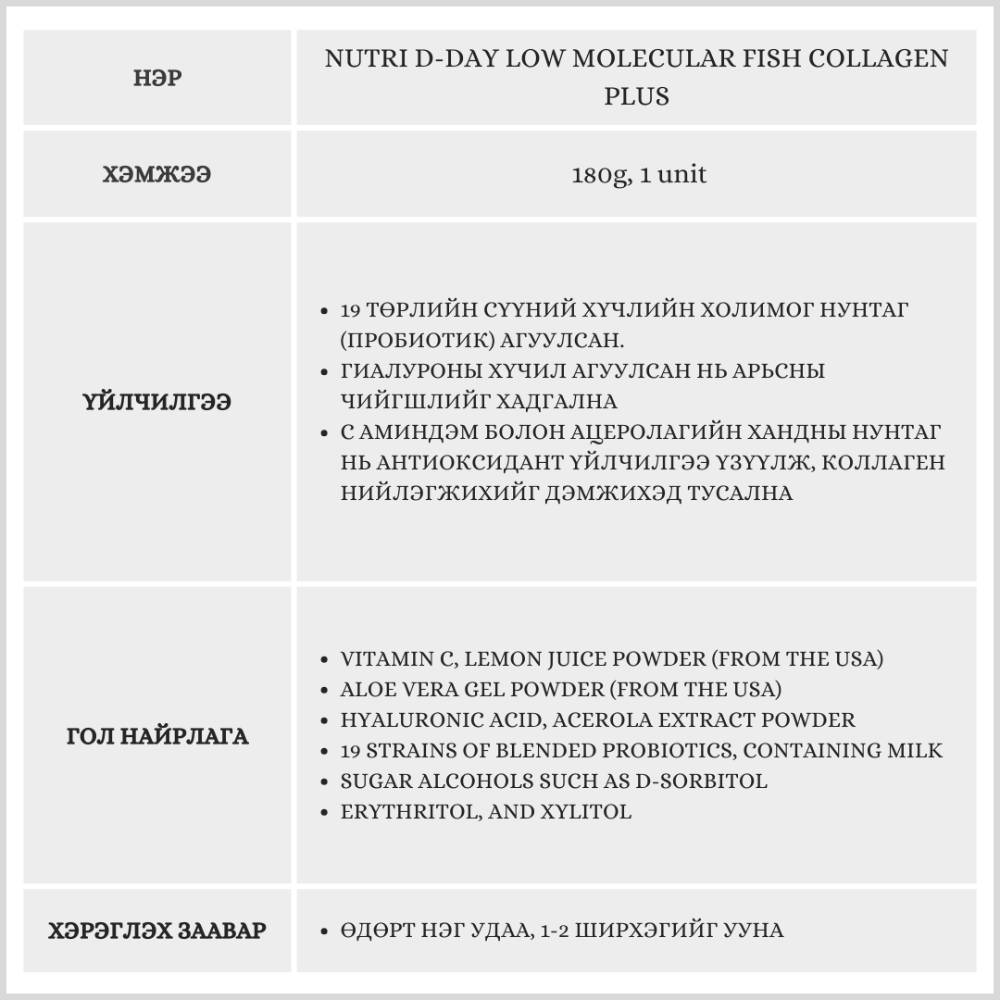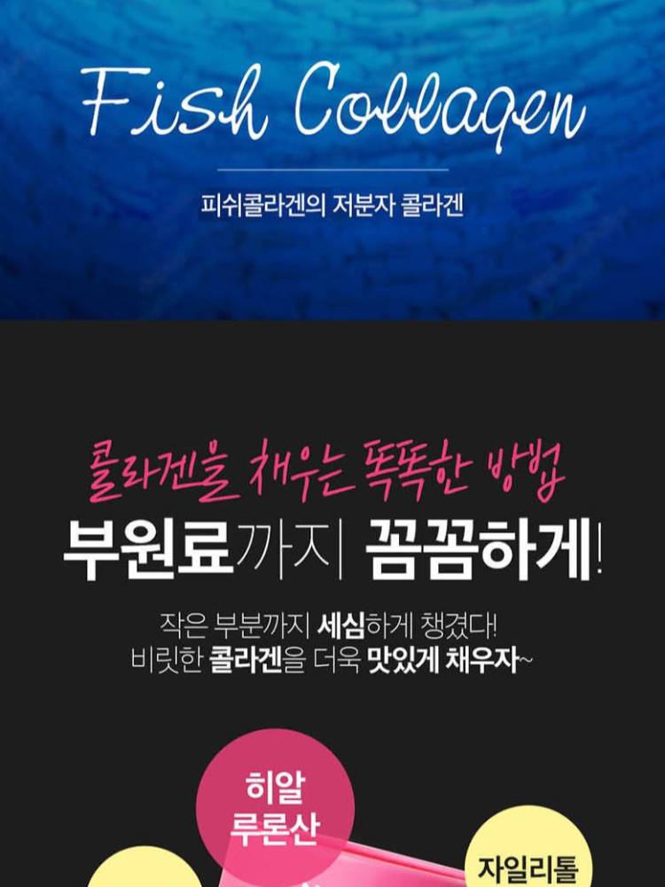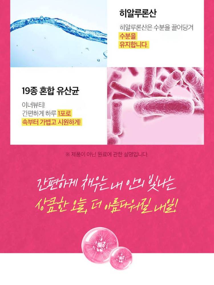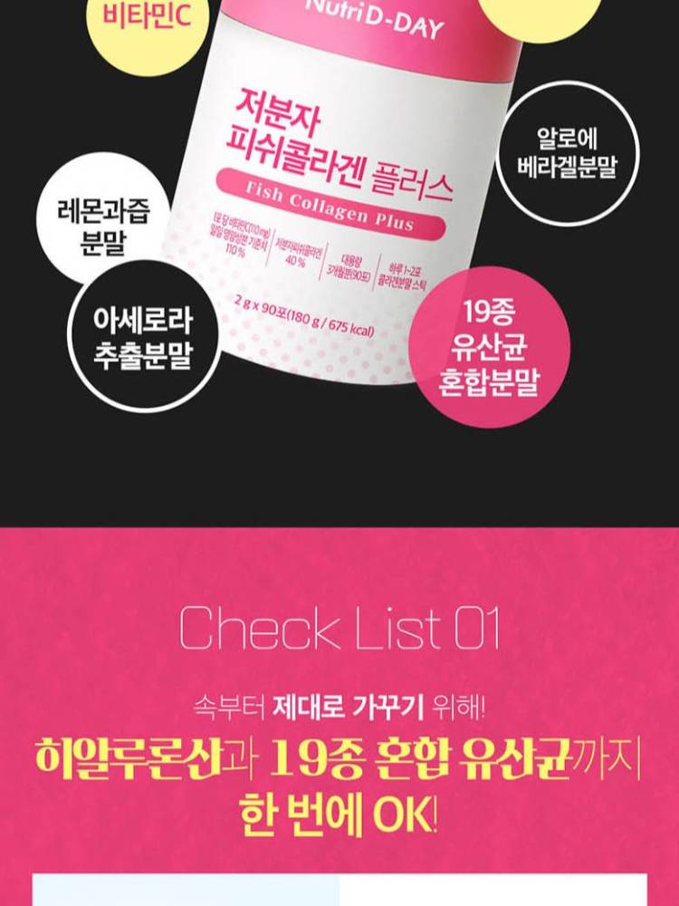 Энэ бүтээгдэхүүн нь бага молекулт загасны коллаген ашигласан тул биед шингэц сайтай бөгөөд арьсны уян хатан байдлыг дэмжих Гиалуроны хүчил, С аминдэм зэрэг туслах орцуудыг агуулсан.19 төрлийн Пробиотик болон Алое вера гель агуулсан нь гэдэсний эрүүл мэндийг дэмжих давхар үйлчилгээтэй юм.