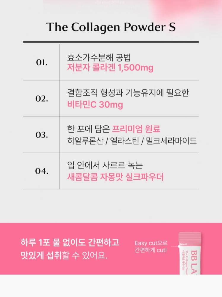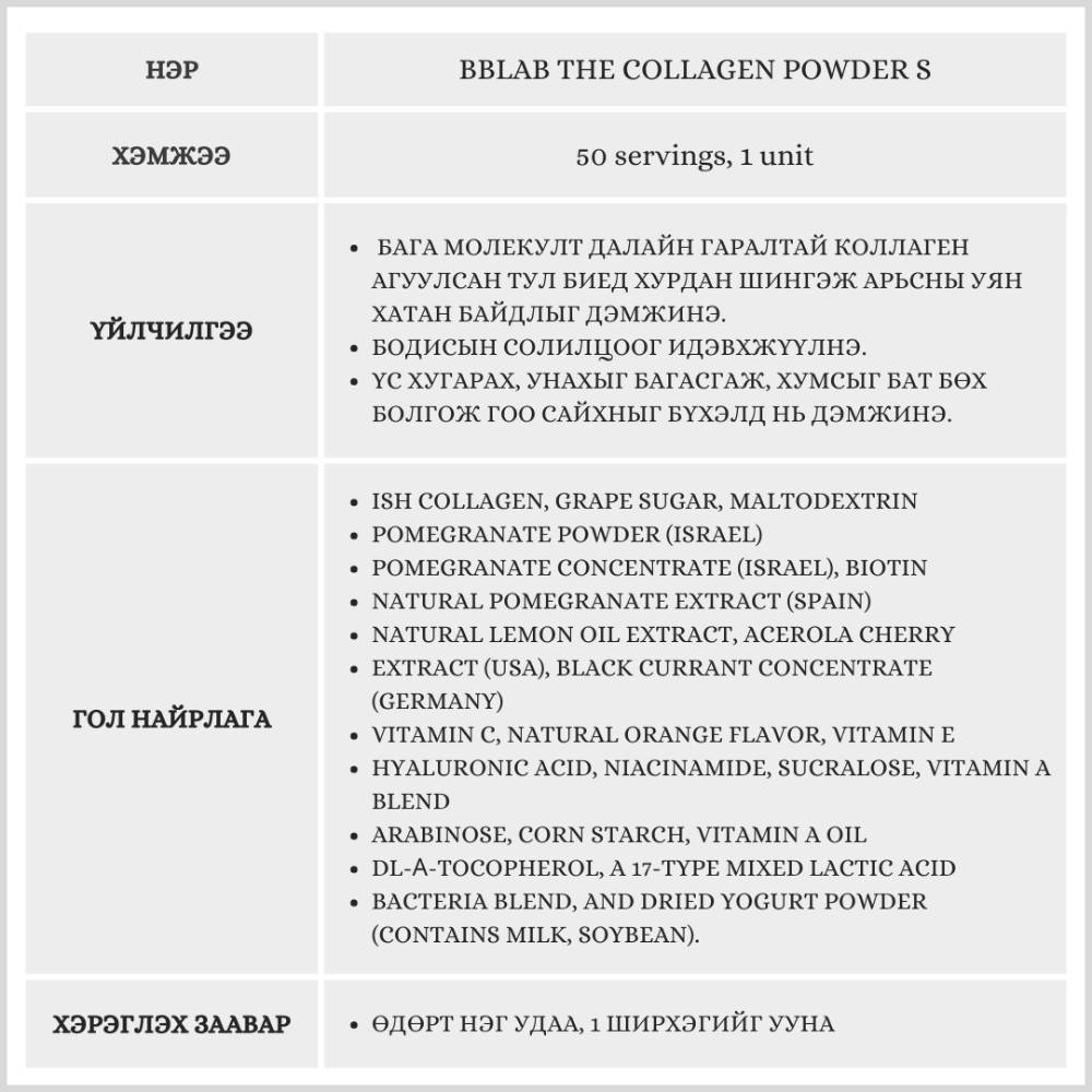 Загасны коллаген агуулсан тул биед амархан шингэнэ. Арьсны уян хатан байдал болон чийгшлийг дотроос нь дэмжинэ. Өдөр бүр хэрэглэхэд тохиромжтой нунтаг хэлбэртэй бөгөөд ус, ундаанд амархан уусдаг тул уухад хялбар. Арьсыг илүү гэрэлтсэн, толигор харагдуулна.