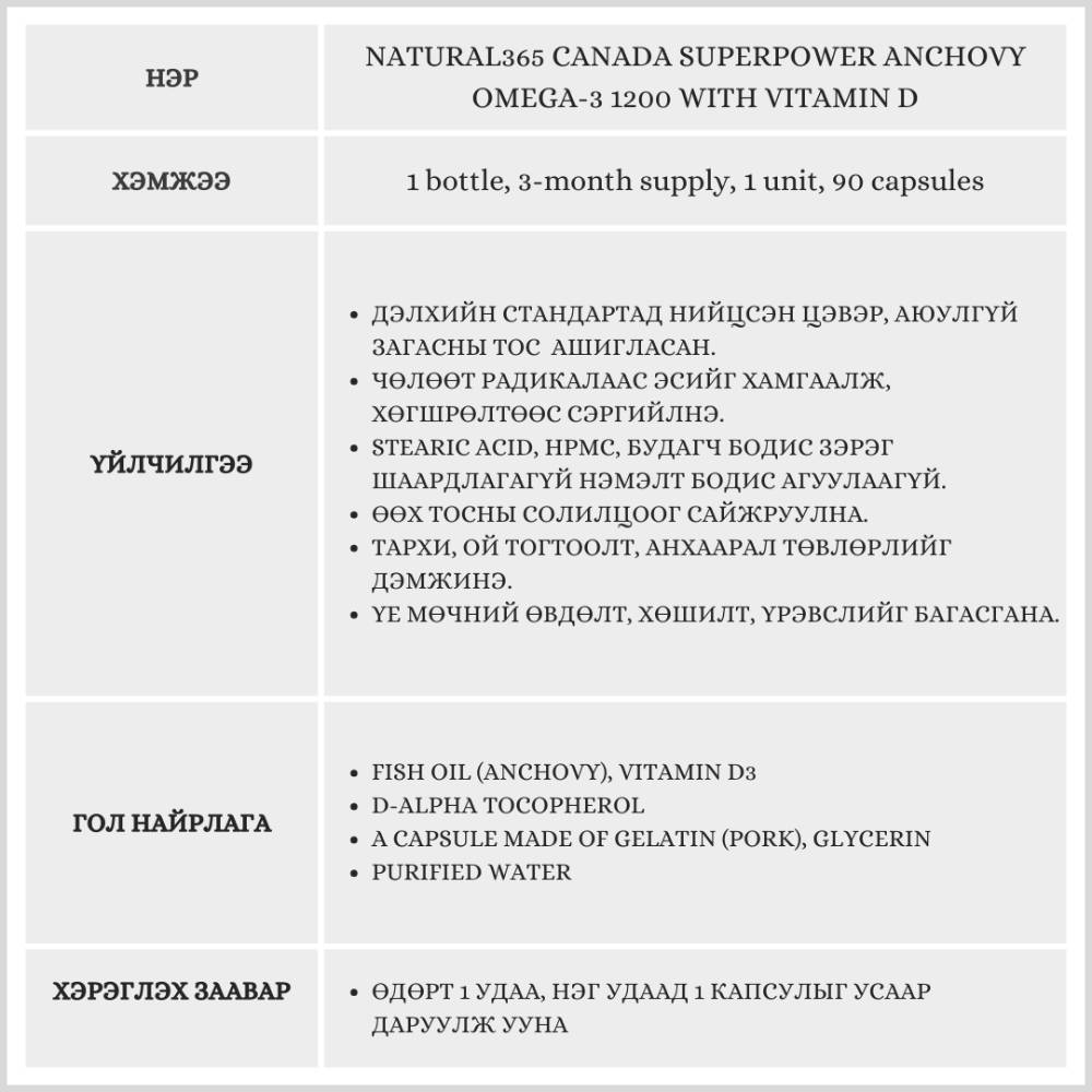 Уг Omega-3 нь Канад DSM-ийн цэвэр түүхий эдээр хийсэн, өндөр агууламжтай EPA+DHA агуулсан омега бөгөөд эсийг хамгаалах антиоксидант витамин Е-тэй. Энэ нь зүрх судас, тархи, анхаарал төвлөрөлд сайн нөлөө үзүүлж, үрэвсэл болон цусны өөх тосыг бууруулахад дэмжлэг үзүүлнэ.