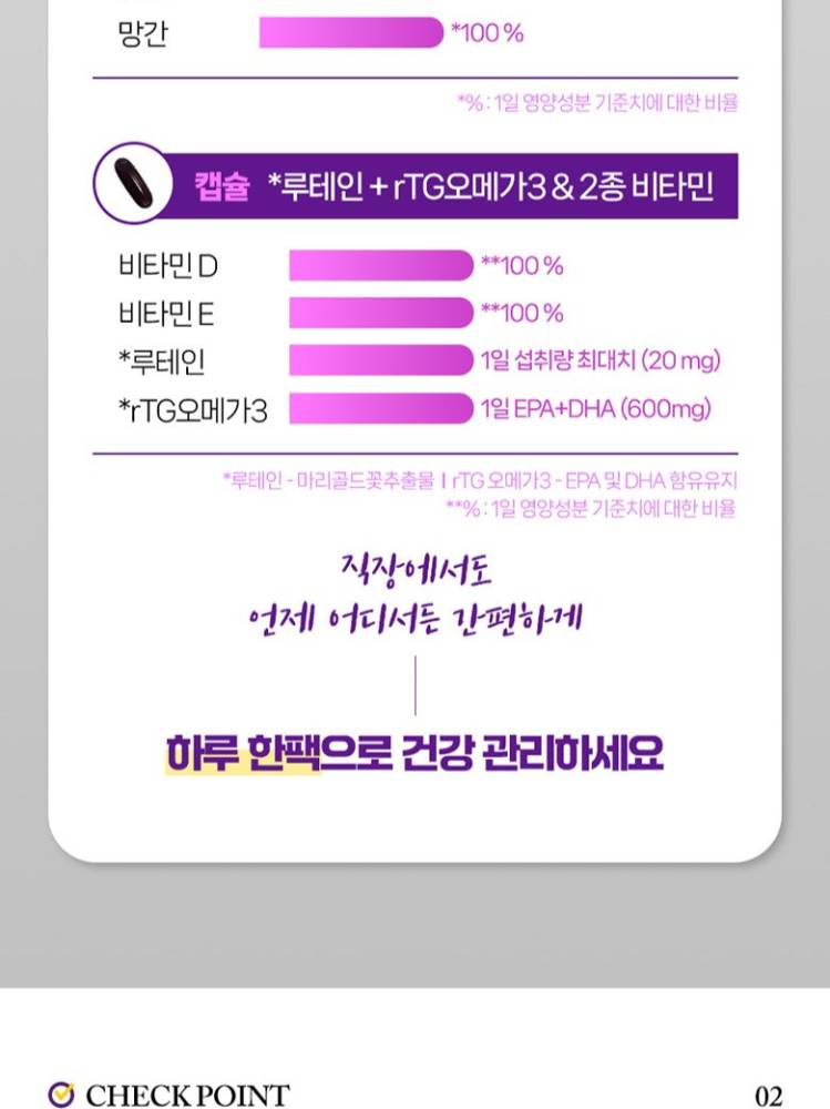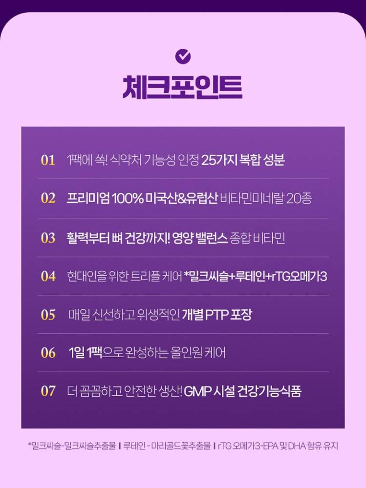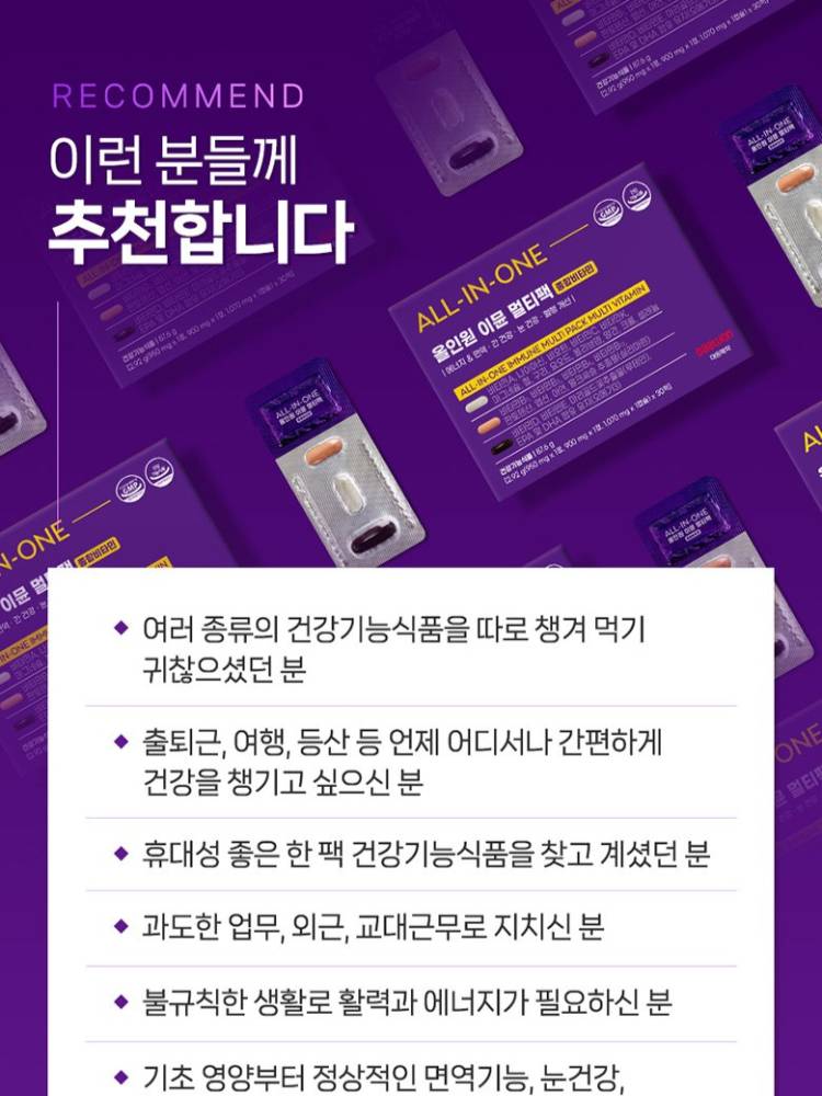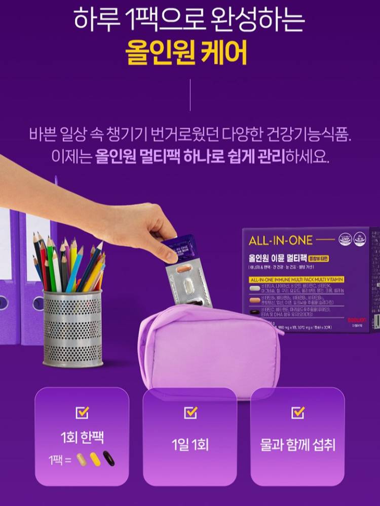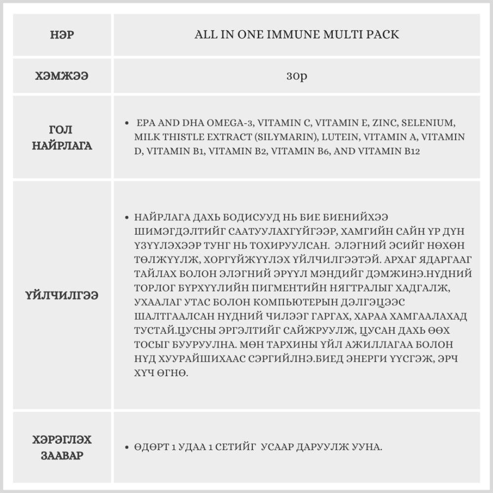 Орчин үеийн хүмүүст нэн шаардлагатай 20 гаруй төрлийн шим тэжээлийг нэг дор багтаасан эрүүл мэндийн нэмэлт бүтээгдэхүүн.Олон төрлийн витамины сав тус тусад нь авч явах шаардлагагүй. Өдөрт ердөө нэг уут хэрэглэснээр элэг, нүд, цусны эргэлт, дархлаагаа бүрэн хамгаалж чадна.