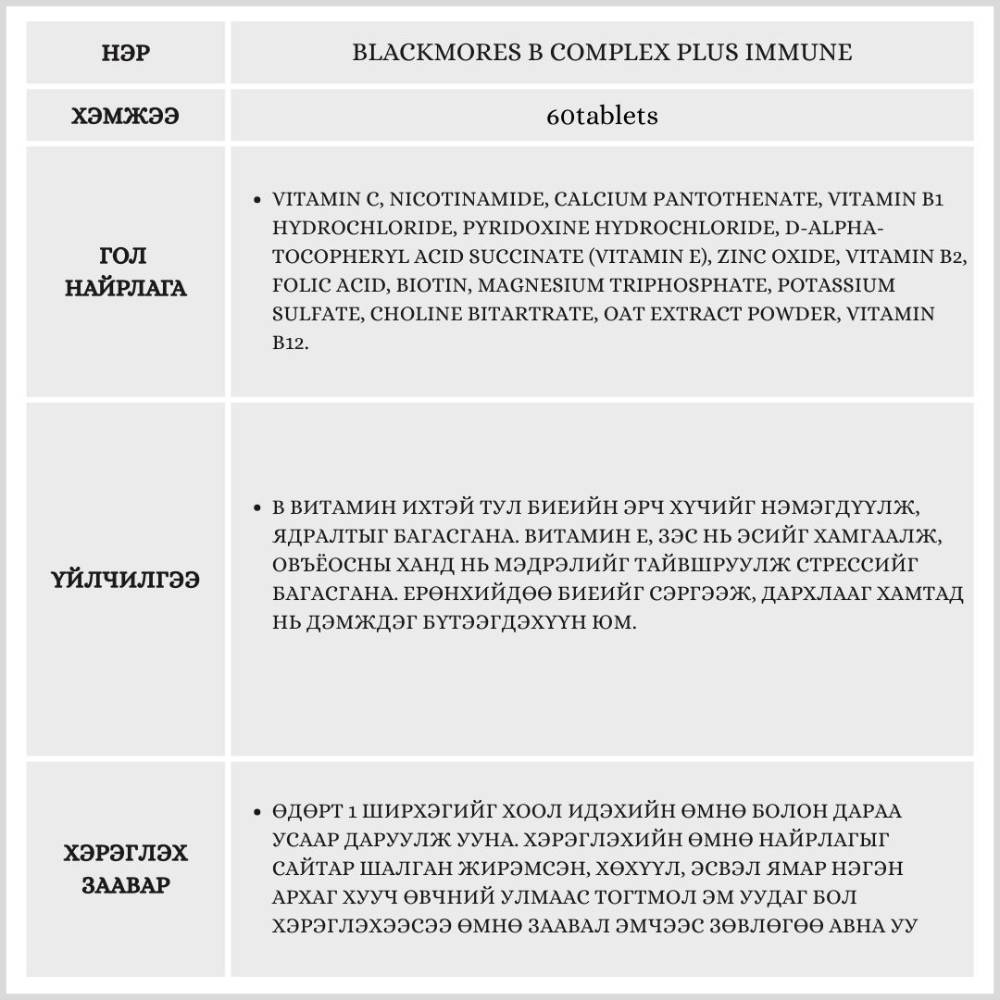 Витамин B-ийн төрлүүдийг исэлдэлтийн эсрэг витамин C, E болон дархлаанд нэн тустай цайртай хослуулсан бүтээгдэхүүн юм. Стресс ихтэй, амархан ядардаг хүмүүсийн дархлааны системийг бэхжүүлж, биеийг энергиэр хангана.