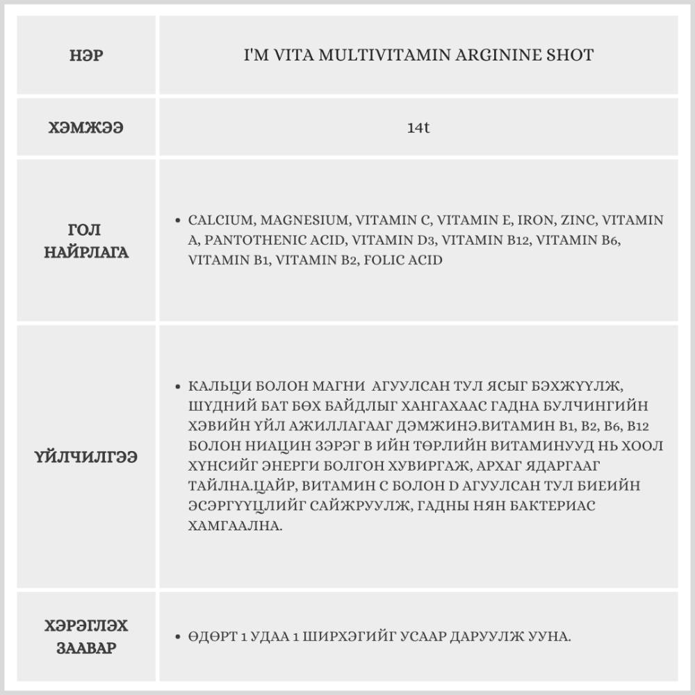 Энэ бүтээгдэхүүн нь өдөр тутмын эрч хүч, дархлаа дэмжих зориулалттай шот юм. Нэг хайрцагт 14 ширхэг агуулагддаг бөгөөд хэрэглэхэд хялбар, хурдан шингэдэг.