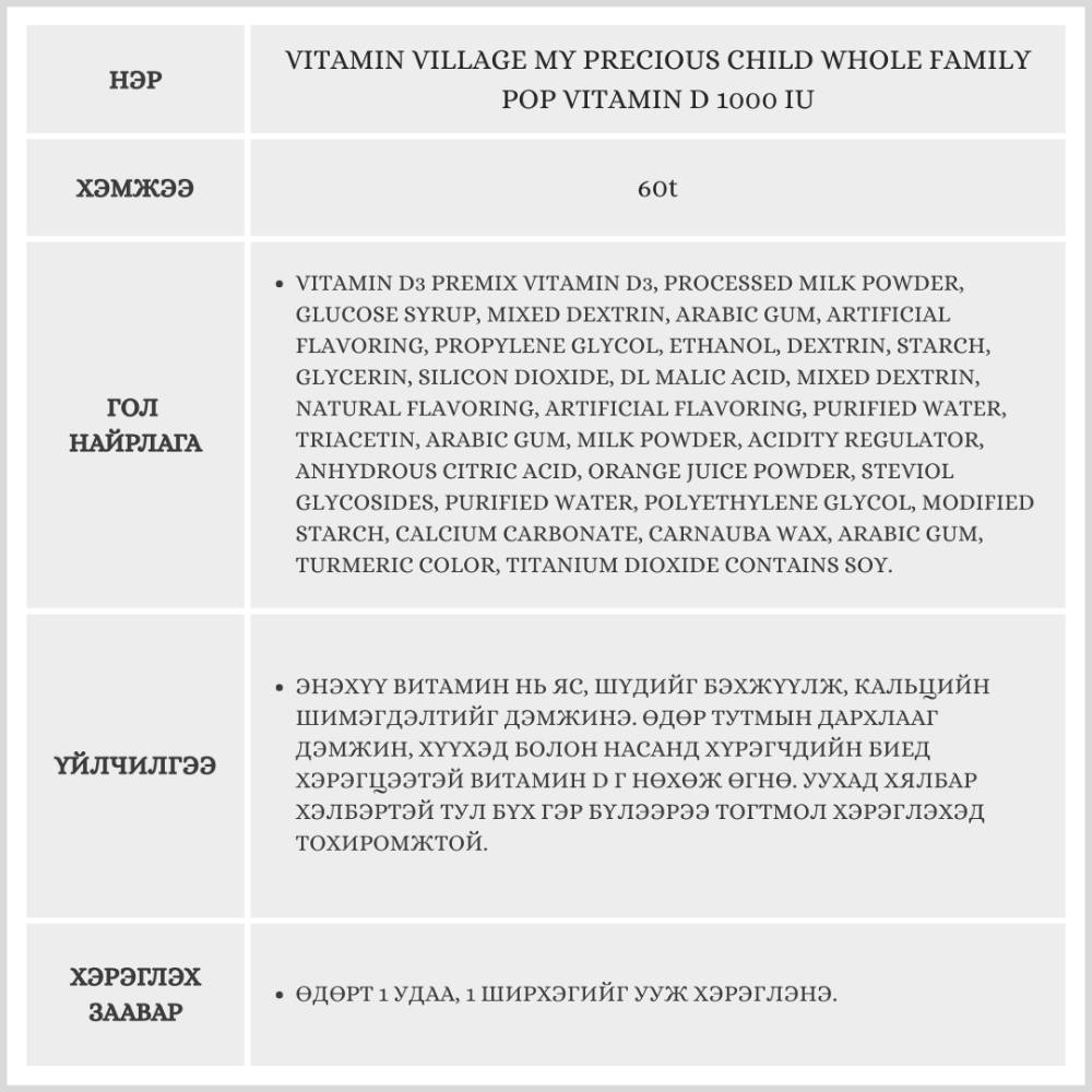 Энэхүү витамин нь яс, шүдийг бэхжүүлж, өдөр тутмын дархлааг дэмжинэ. Хүүхэд болон насанд хүрэгчид хэрэглэх боломжтой.