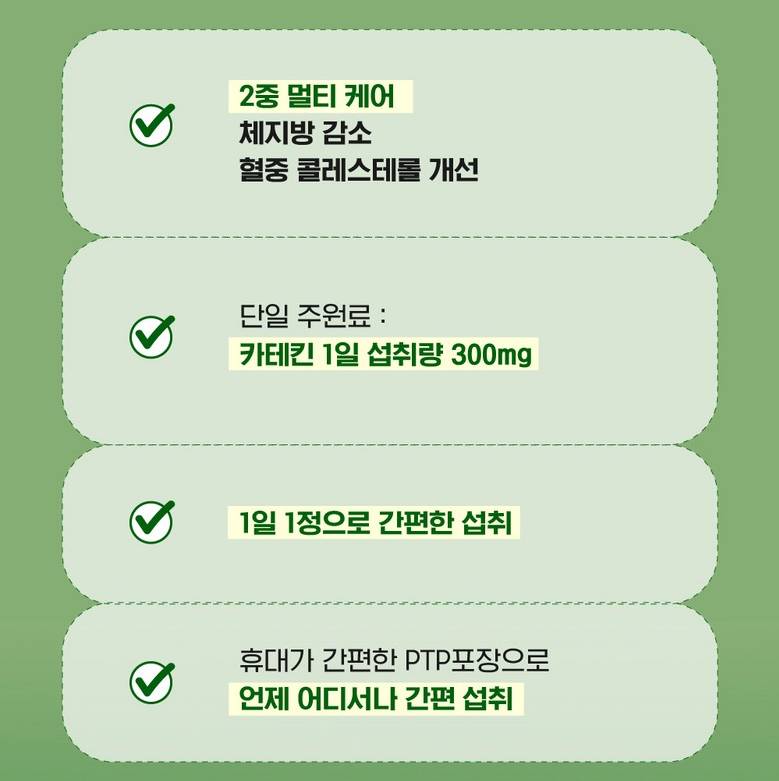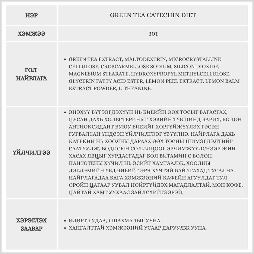 Энэхүү бүтээгдэхүүн нь ногоон цайны ханд буюу Катекин агуулсан, биеийн жингээ хянахад туслах гурвалсан үйлчилгээтэй хүнсний нэмэлт бүтээгдэхүүн юм. Биеийн өөх тосыг бууруулах, цусан дахь холестерины хэмжээг сайжруулах болон биеийг хоргүйжүүлэх үл исэлдүүлэгч үйлчилгээг нэг дор үзүүлнэ.
