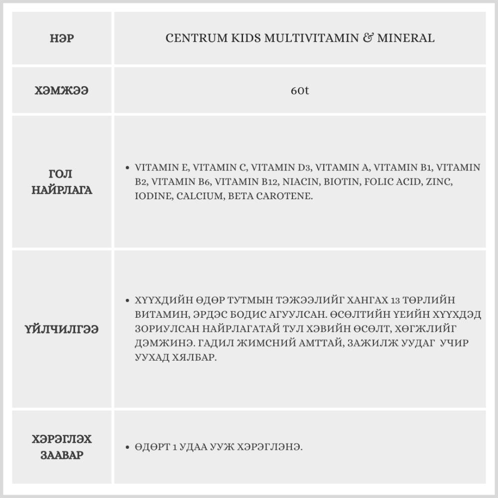 Энэхүү мультивитамин нь хүүхдэд хэрэгцээтэй олон төрлийн витамин, эрдсийг агуулсан тул өдөр тутмын тэжээлийн хэрэгцээг нөхөж, хэвийн өсөлт хөгжилд дэмжлэг үзүүлнэ. Дархлааг дэмжиж, эрч хүч, анхаарал төвлөрөл болон биеийн ерөнхий үйл ажиллагааг сайжруулахад тустай.
