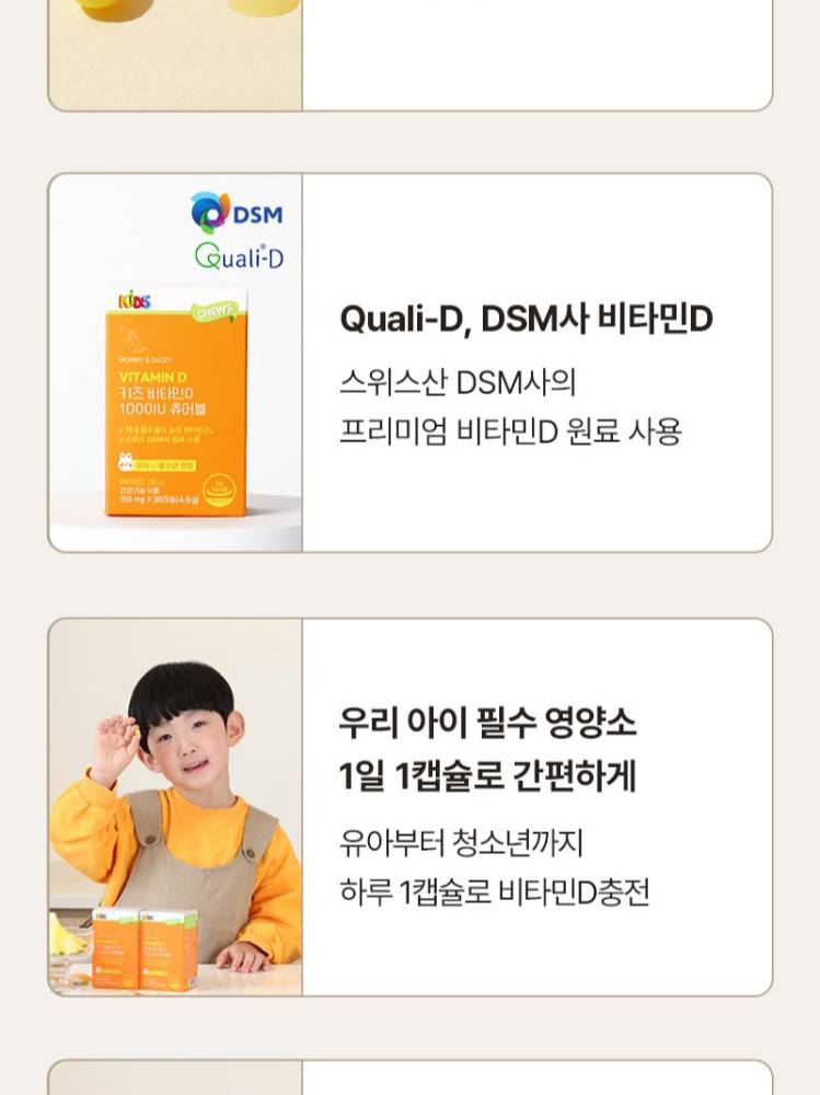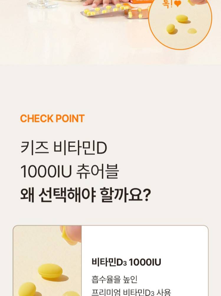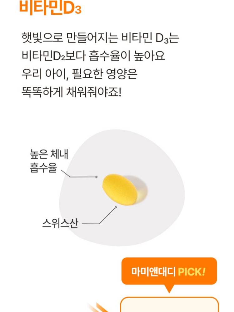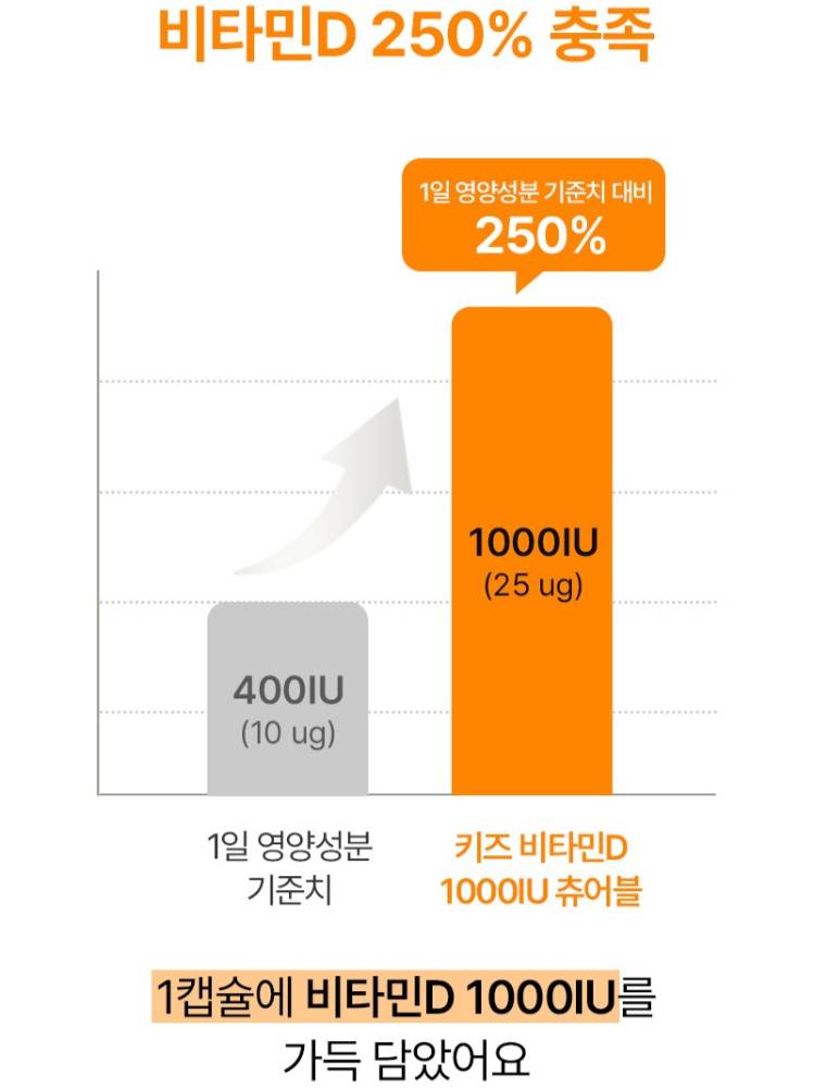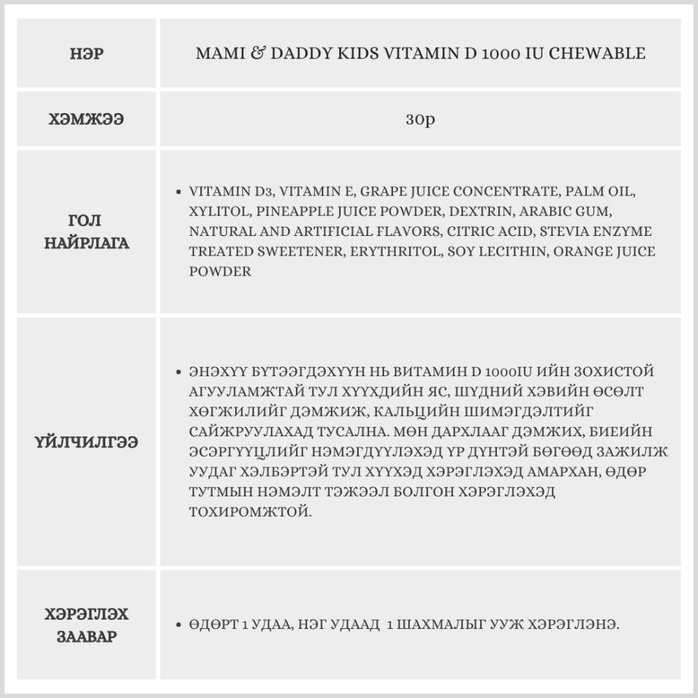 Энэхүү витамин D нь хайрцагтаа 30 ширхэгтэй буюу 1 сарын хэрэглээтэй бөгөөд витамин D 1000IU агуулсан тул хүүхдийн яс, шүдний хэвийн өсөлт хөгжил-ийг дэмжиж, кальцийн шимэгдэлтийг сайжруулахад тусална.