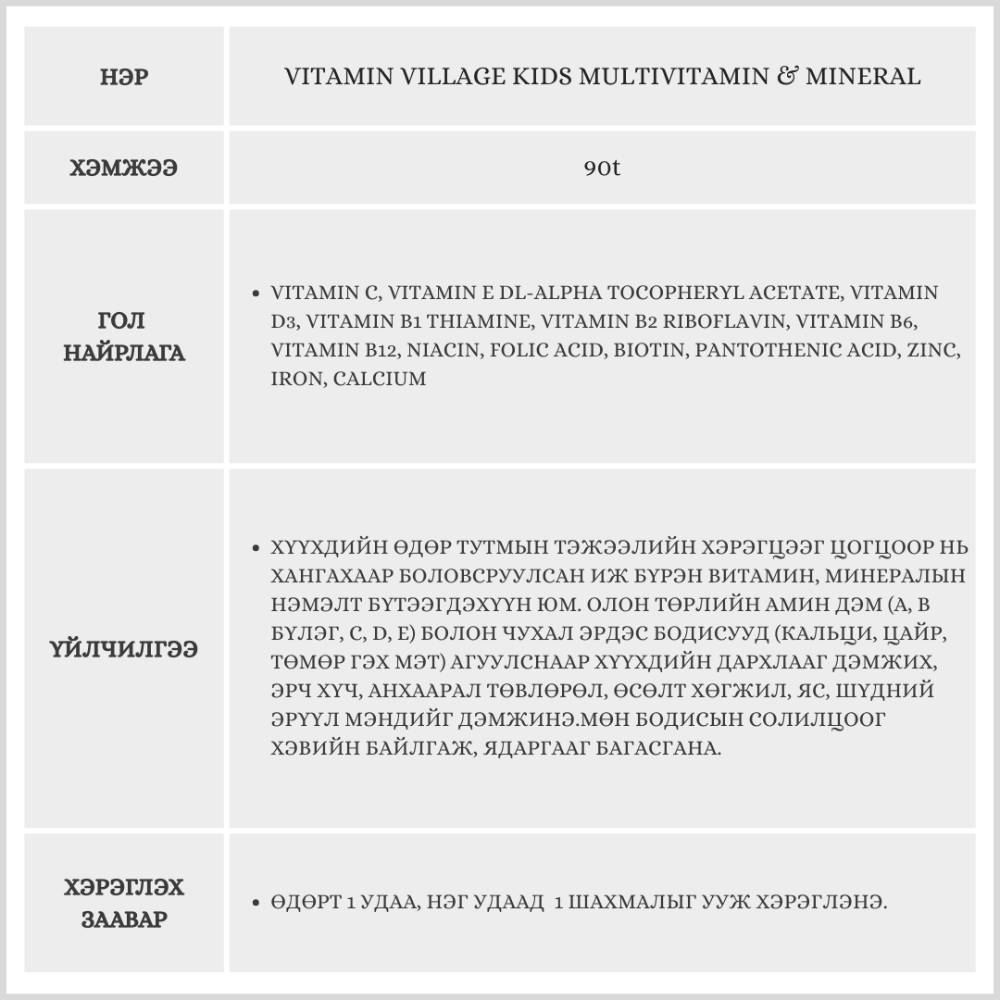 Энэхүү бүтээгдэхүүн нь 90 ширхэгтэй тул 3 сарын хэрэглээг хангана. Хүүхдийн өдөр тутмын хэрэгцээнд тохирсон олон төрлийн витамин, минерал агуулж, дархлааг дэмжих, эрч хүчийг нэмэгдүүлэх, өсөлт хөгжил болон биеийн тэнцвэртэй хөгжлийг дэмжинэ.