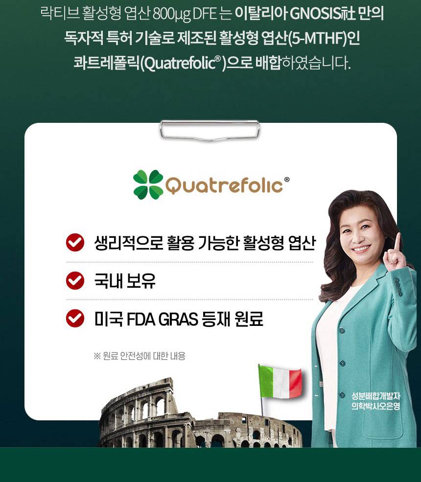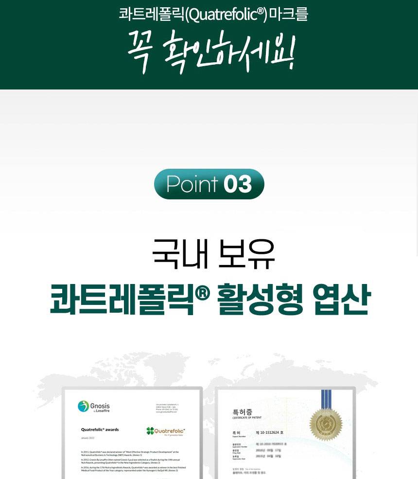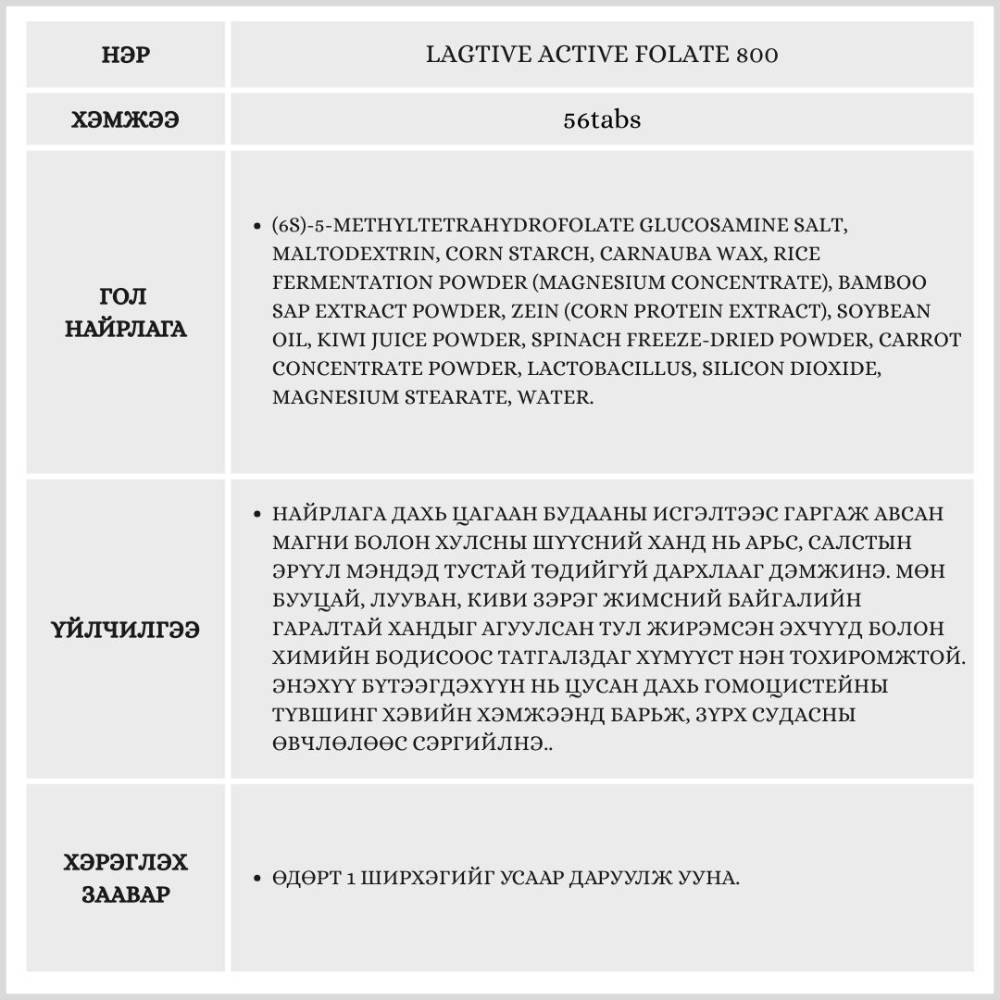 Энэхүү бүтээгдэхүүн нь бие махбодод шууд шингэдэг идэвхжүүлсэн фолийн хүчил/Quatrefolic/ агуулсан бөгөөд эс болон цусны улаан эс бүрэлдэхэд чухал үүрэг гүйцэтгэнэ.