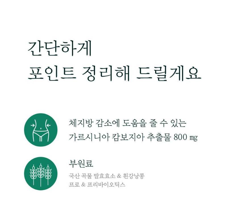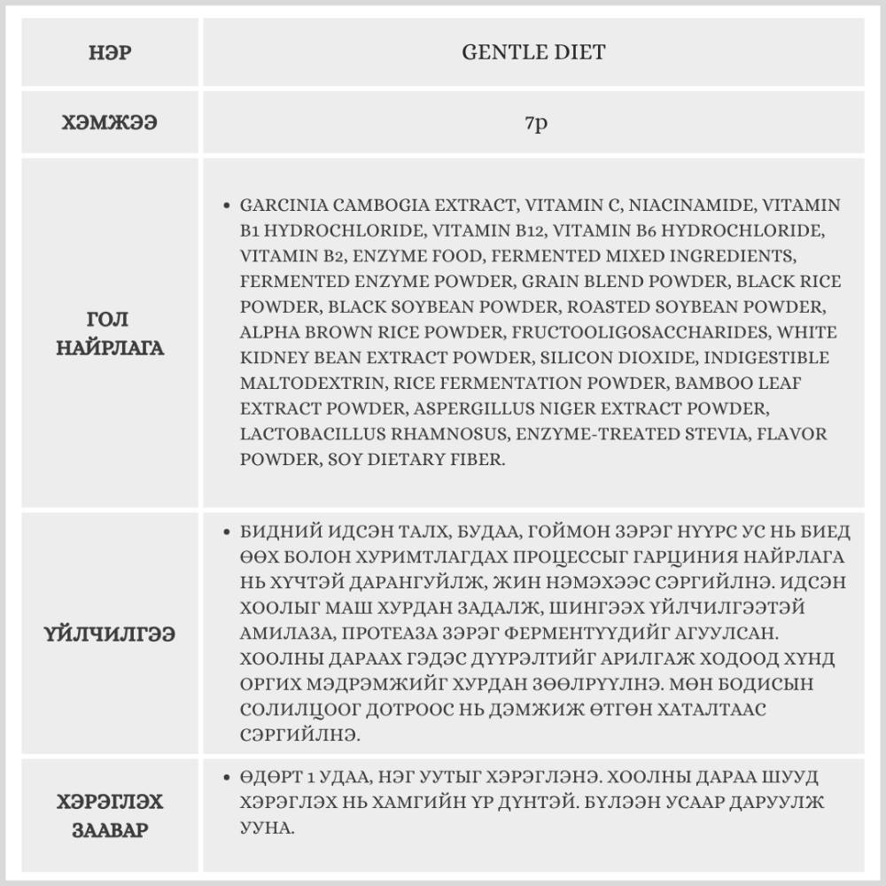 Нүүрс ус өөх болохыг зогсоох гарциния болон хоол задлах ферментүүдийг хамтад нь агуулсан тул тураахын зэрэгцээ хоол боловсруулалтыг дэмжинэ.
