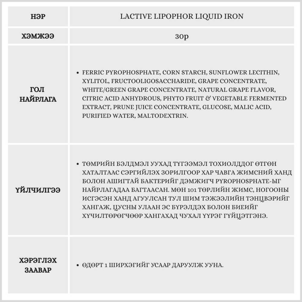Төмрийн бэлдмэлд байдаг өвөрмөц эвгүй амтыг бүрэн дарж, усан үзмийн амттай болгосон бөгөөд шингэн тул хаана ч хэрэглэх боломжтой. Хоол боловсруулах эрхтэнд ачаалал өгөхгүй тул жирэмсэн эхчүүд болон ходоод мэдрэмтгий хүмүүс хэрэглэхэд нэн тохиромжтой.