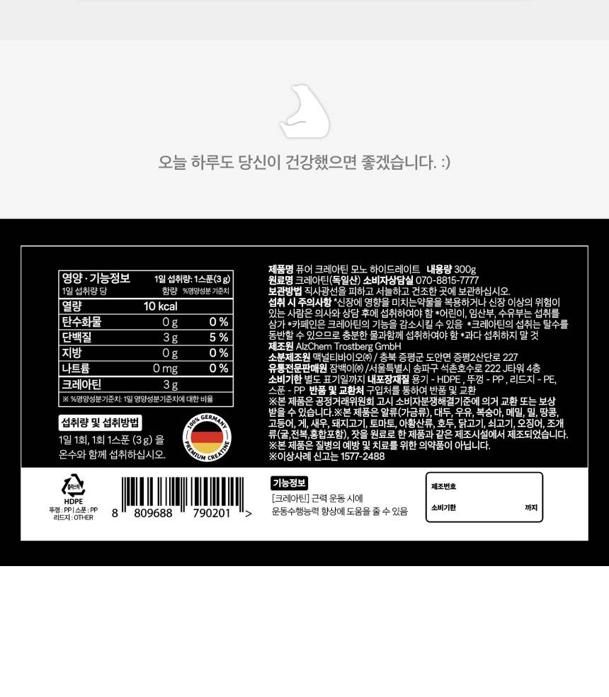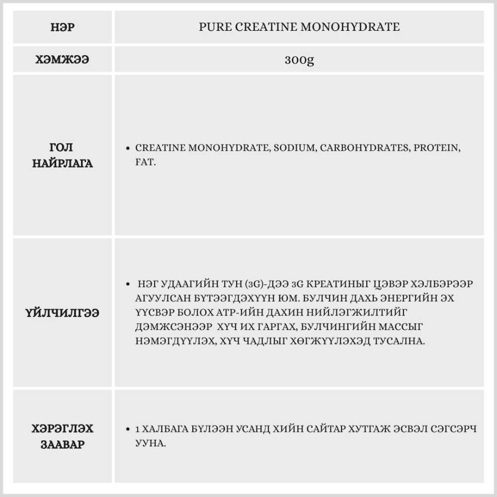 Энэхүү бүтээгдэхүүн нь цэвэр креатин монохидрат бөгөөд дасгал хөдөлгөөн хийх үед булчингийн хүч болон тэсвэр хатуужлыг нэмэгдүүлэхэд тусалах спортын нэмэлт тэжээл юм.