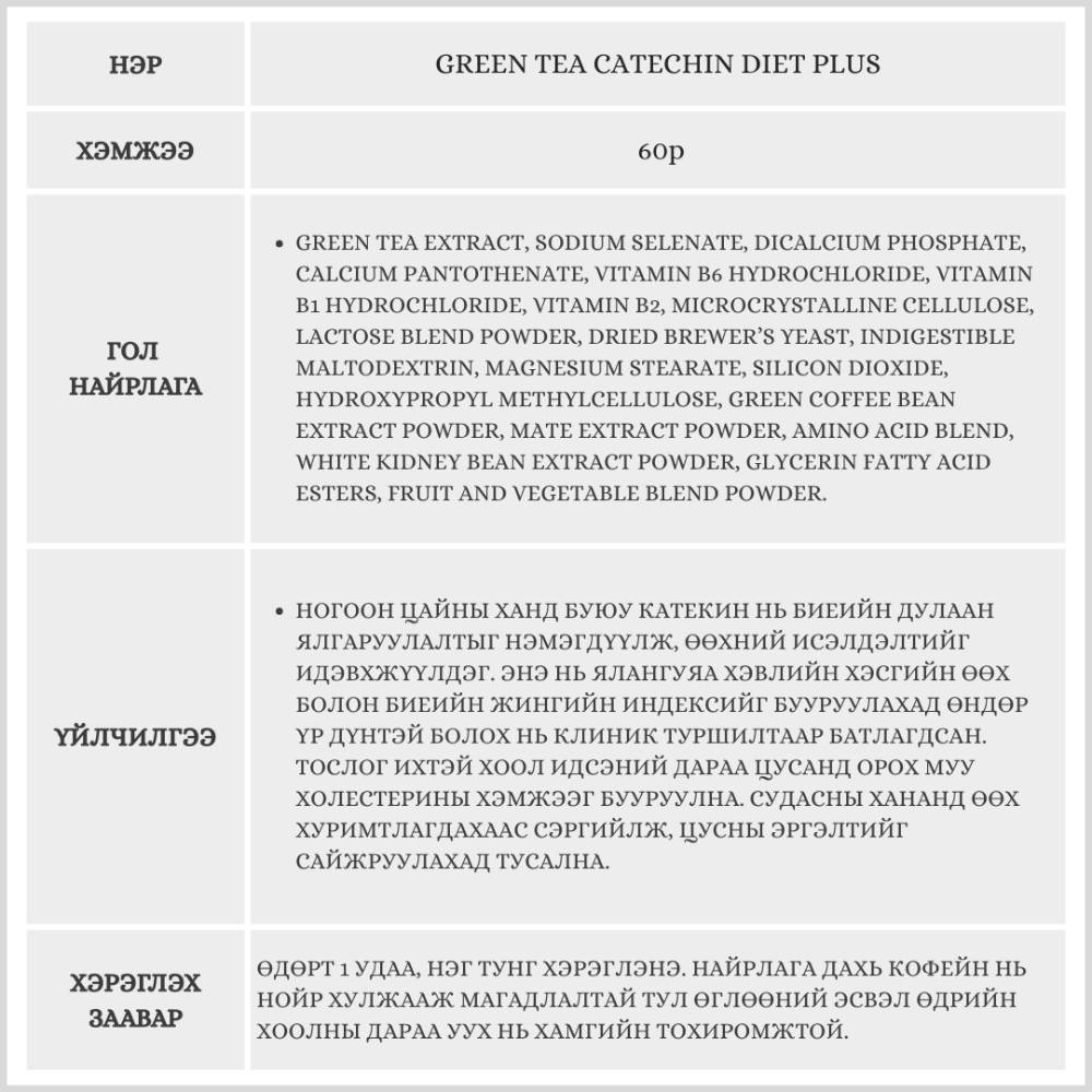 Ногоон цайны үндсэн найрлага болох катекин нь биеийн суурь бодисын солилцоог идэвхжүүлж, хуримтлагдсан өөхийг ялангуяа хэвлийн хэсгийн хайлуулах үйлчилгээтэй.